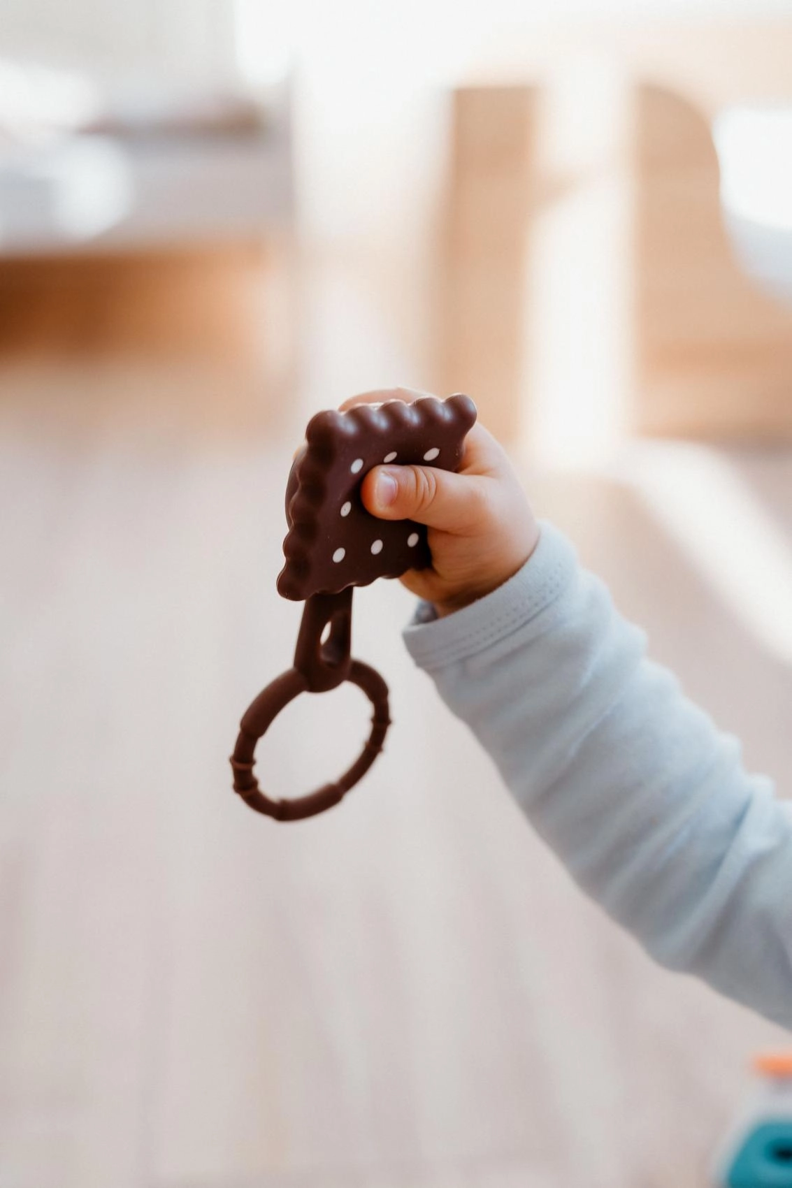 Originalni “kolačić” dizajn potiče znatiželju, mekani i fleksibilni silikon ugodan je na dodir i nježan prema osjetljivim desnima. Nježno zveckanje potiče percepciju zvuka bez ometajuće buke. Teksturirana površina pomaže masirati desni i doprinosi prirodnom umirivanju bebe.