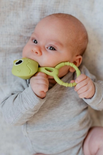 Mek, elastičan silikon nježno masira desni i pomaže umiriti bebu tijekom rasta zubića. Teksture na prstenu pojačavaju učinkovitost masaže.
