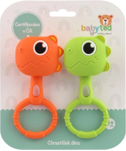 Otkrijte praktičan set 2 kom grickalica i zvečki BABYTED u veselim bojama i s preslatkim dino motivom. Zahvaljujući mekom, sigurnom silikonu idealne su za umirivanje nadraženih desni te istodobno podupiru osjetilni razvoj bebe. Olakšana konstrukcija i promišljen oblik s prstenom pristaju malim dječjim rukama.
