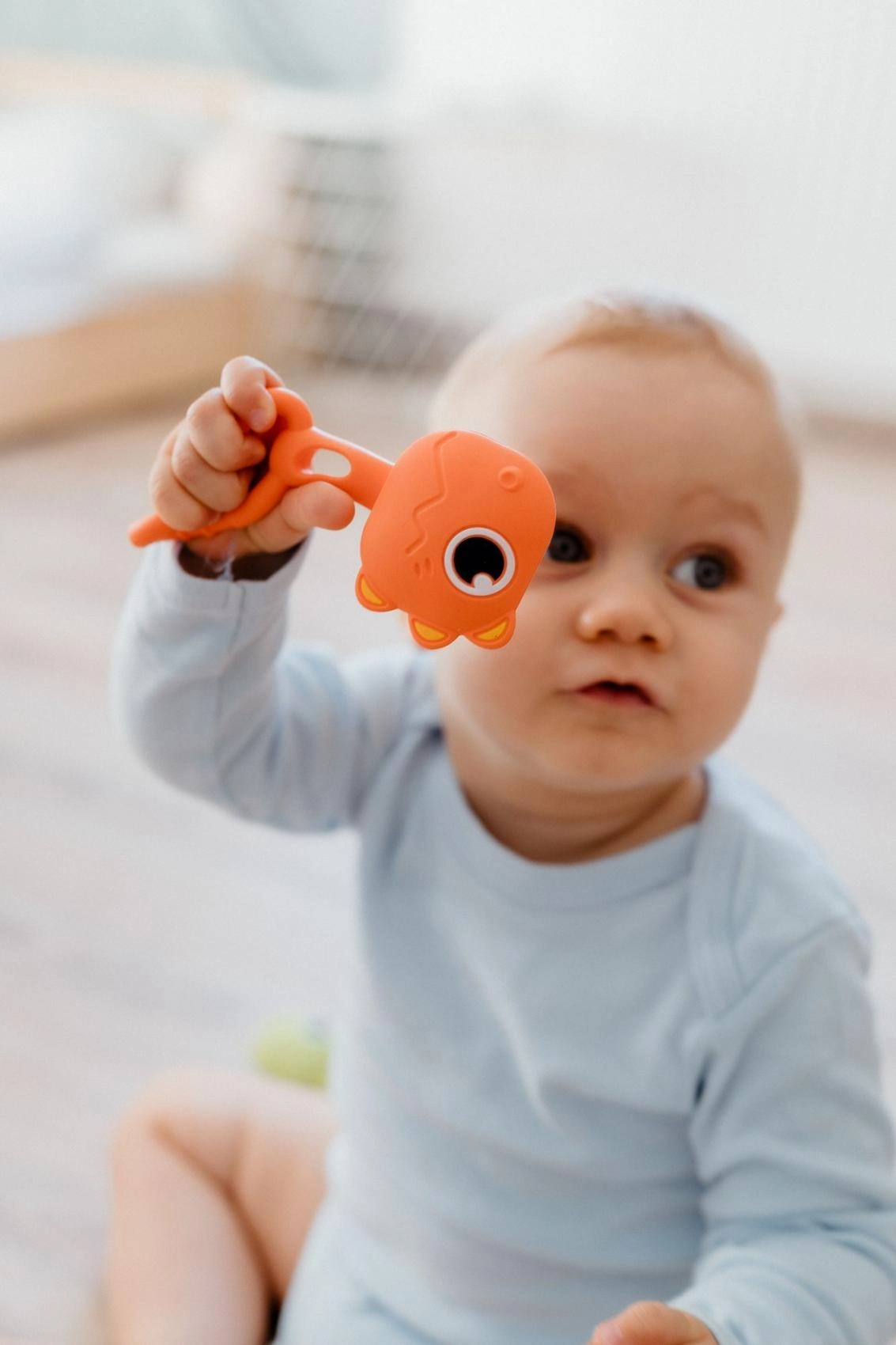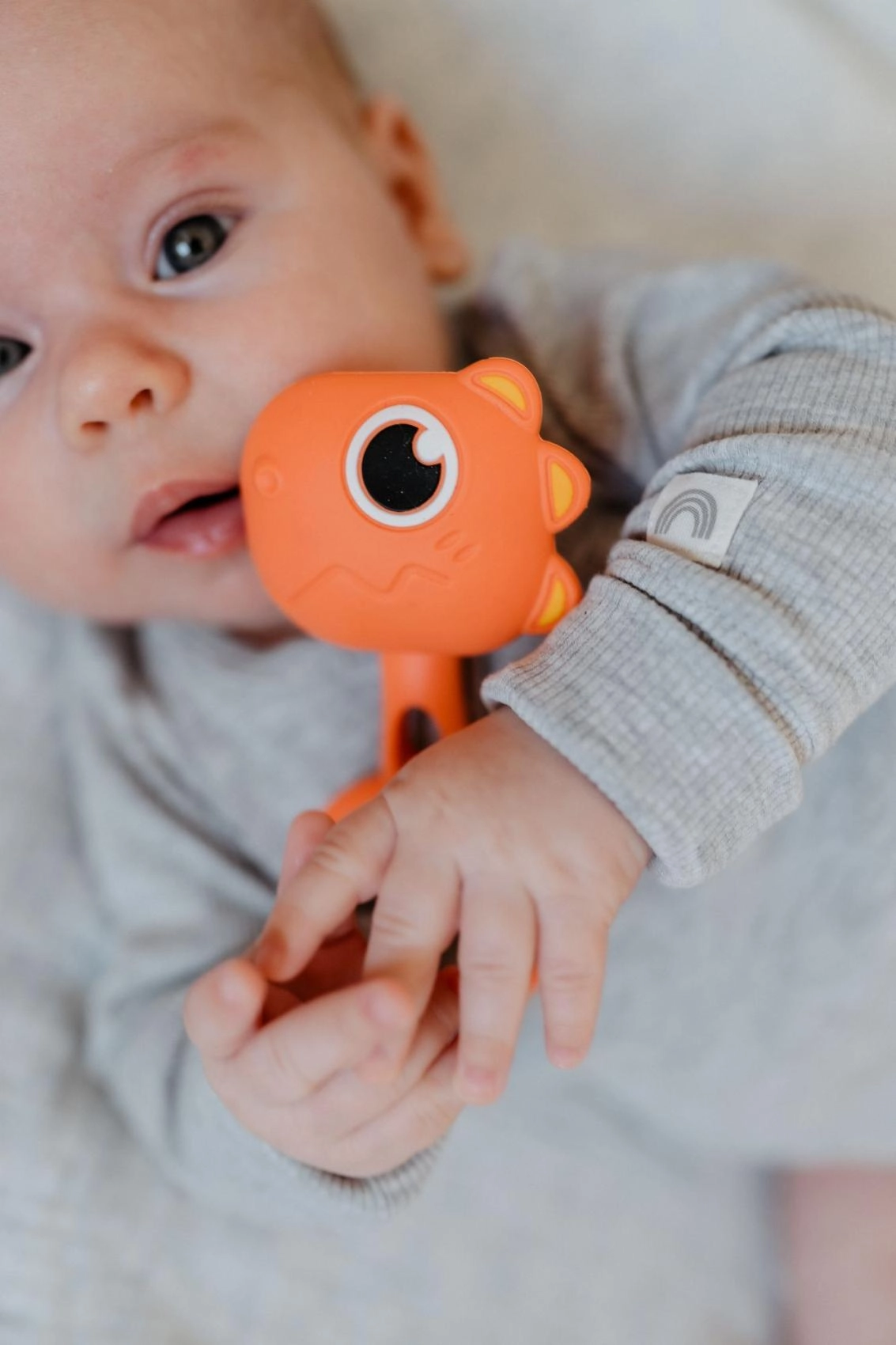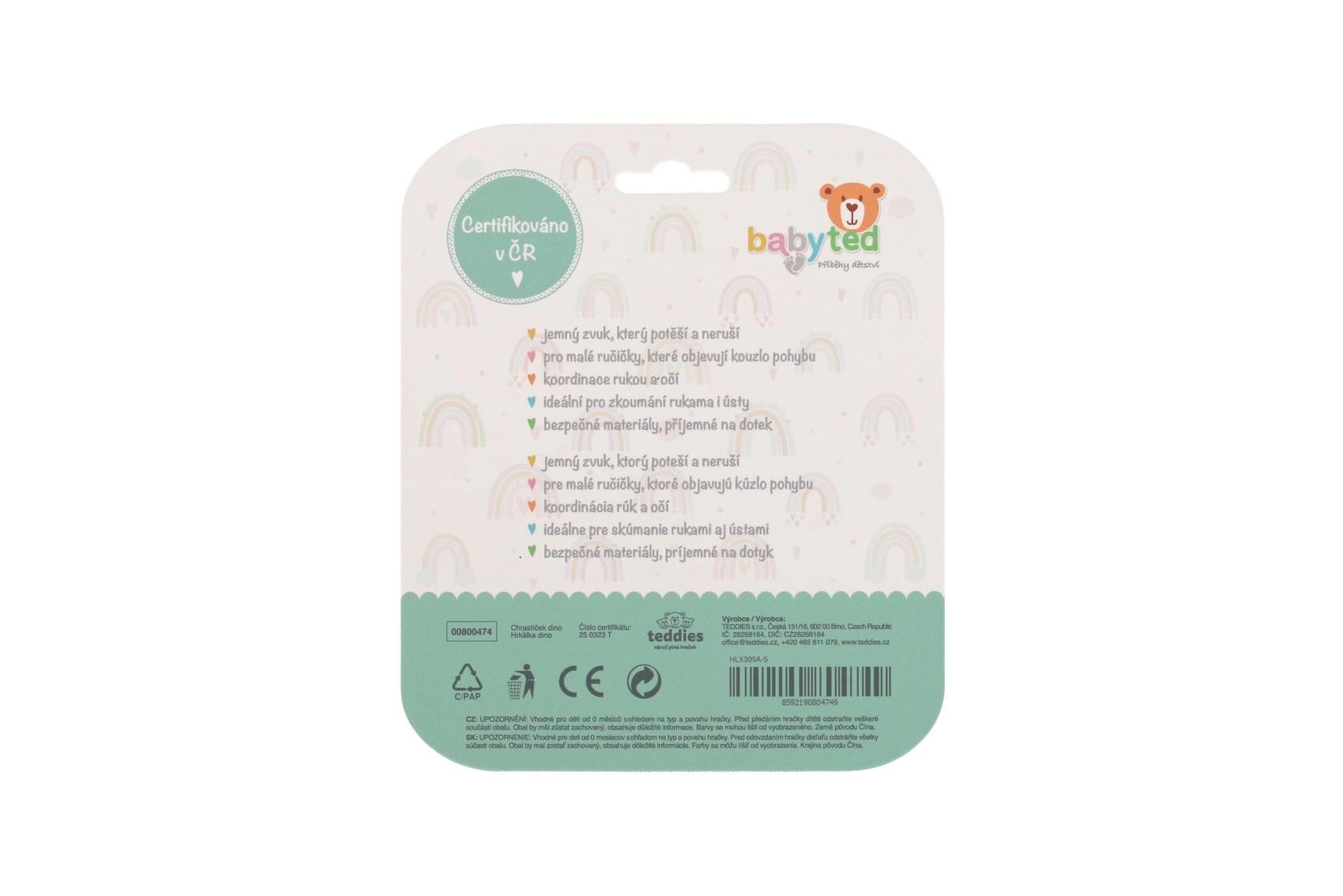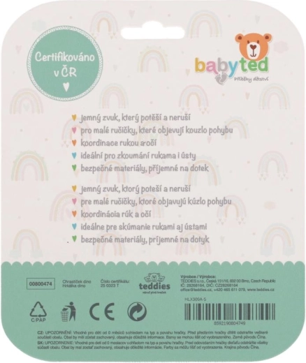 Set dviju dječjih zvečki i grickalica u obliku dinosaura BABYTED je lagan, siguran i dizajniran za male ručice. Meki silikon nježno masira desni pri nicanju zubića, dok ergonomski prsten olakšava držanje i potiče finu motoriku. Blago zveckanje razvija slušnu percepciju i zaokupi bebinu pažnju od prvih dana.