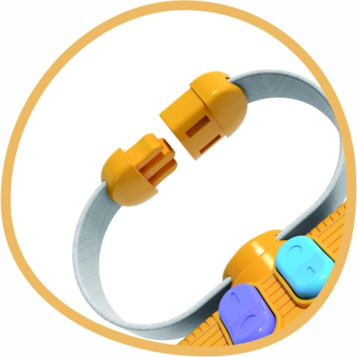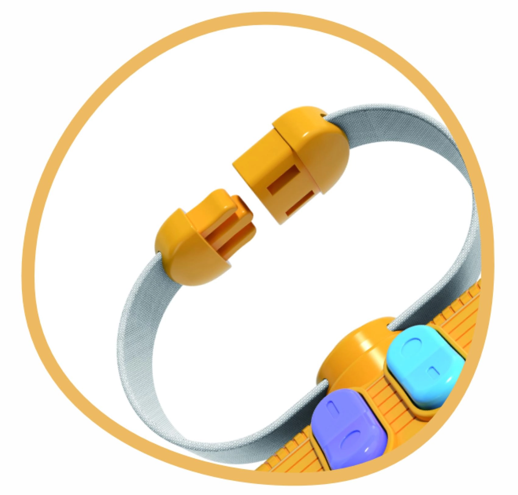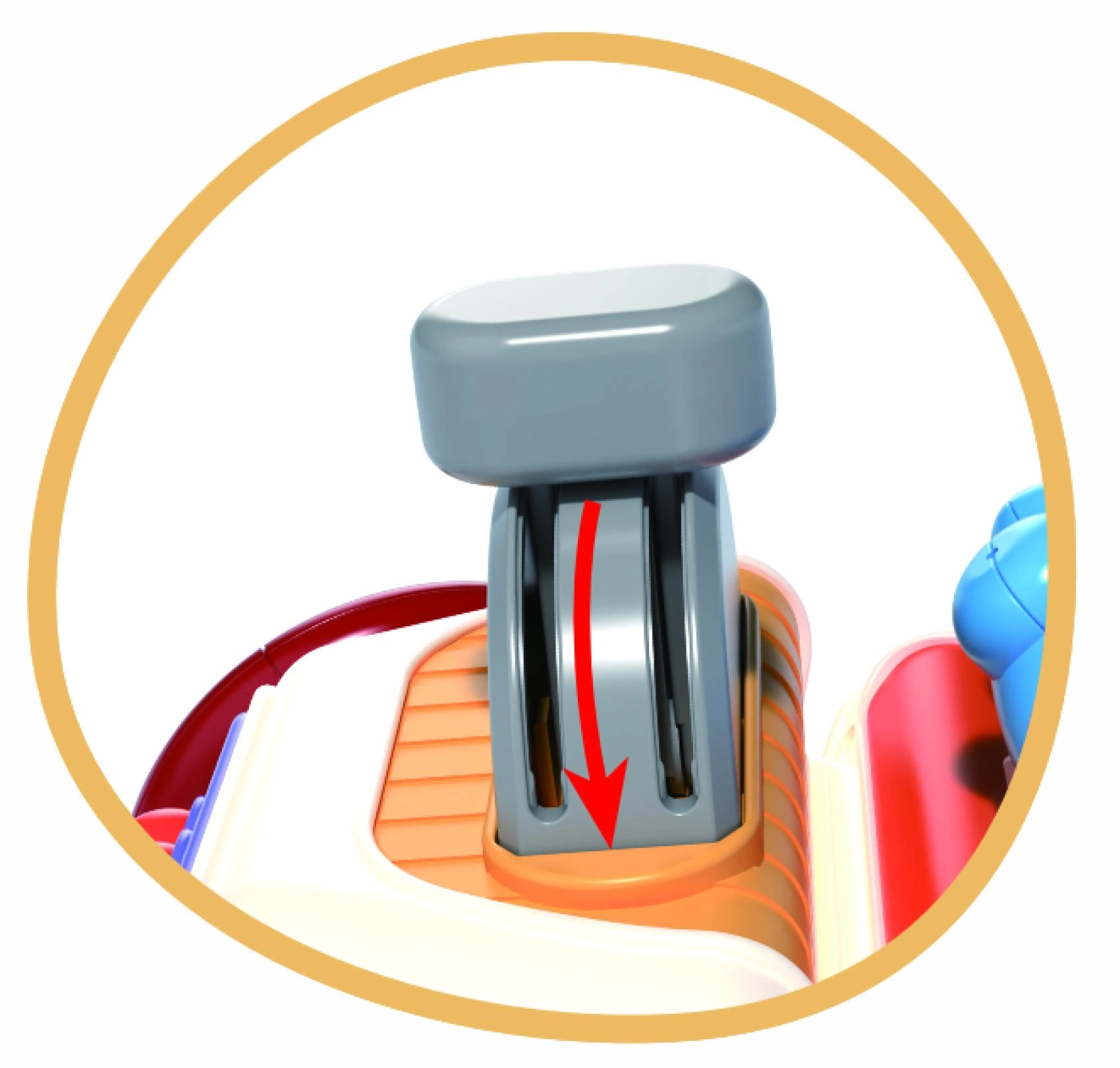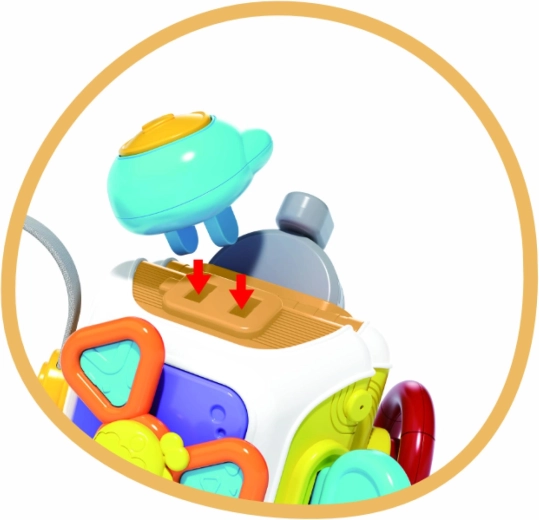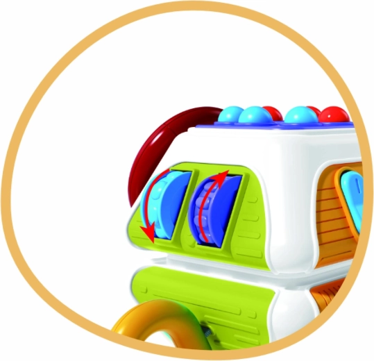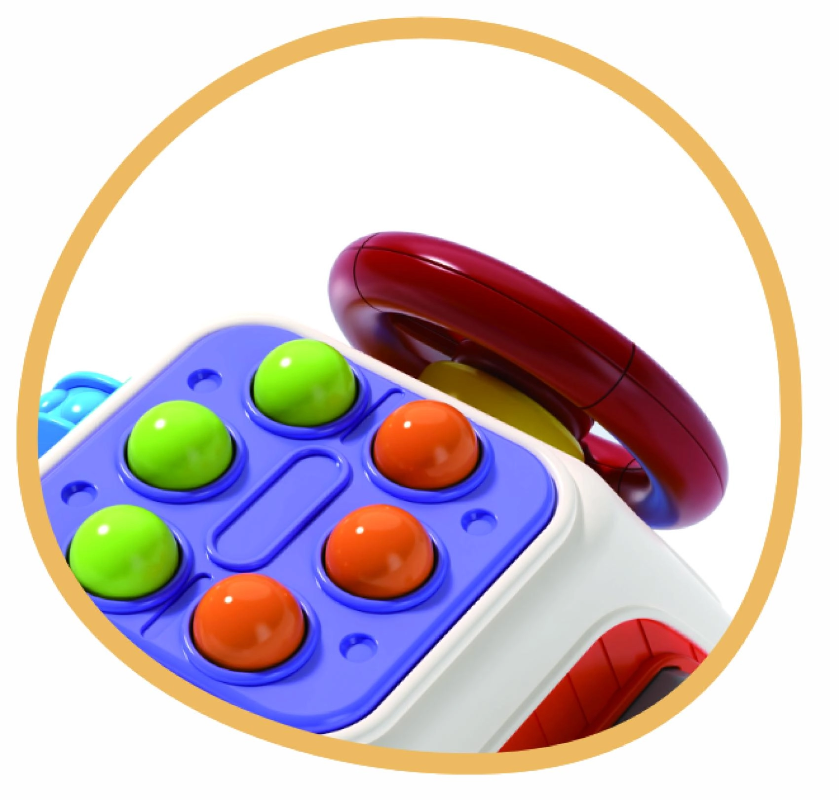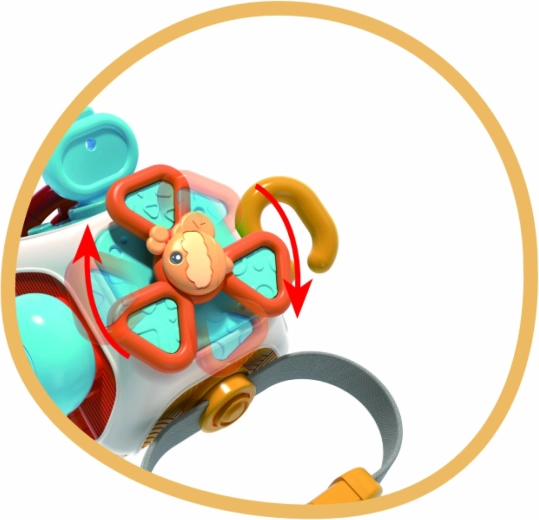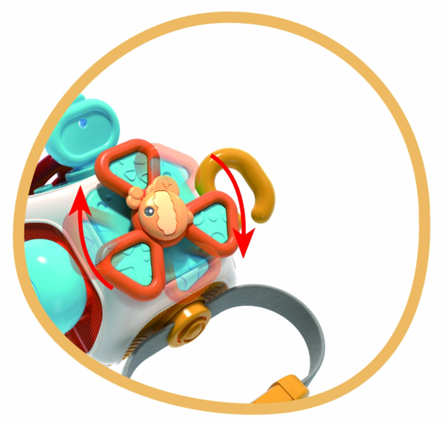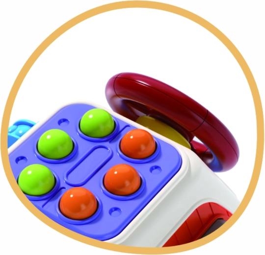 Različiti mehanički elementi pozivaju na stiskanje i pomicanje. Dijete uvježbava prstiće, hvat i razumijevanje uzroka i posljedice.