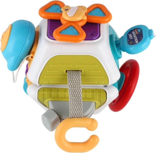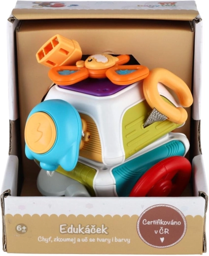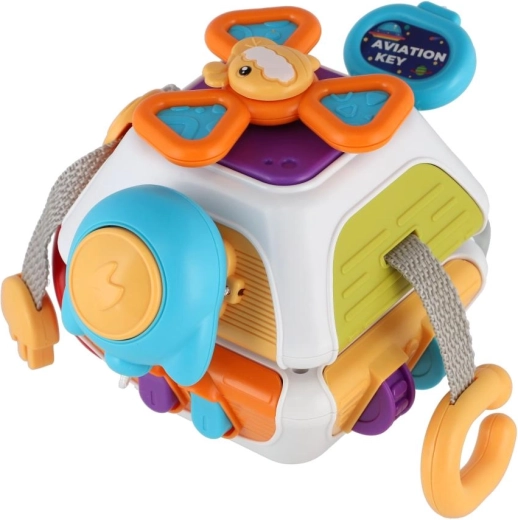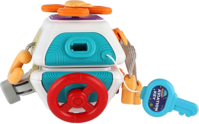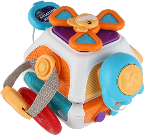 Šarena edukativna kocka za djecu od 6 mjeseci na svakoj strani nudi drugačiju zabavu i razvoj fine motorike. Djeca mogu stiskati, okretati, pomicati i otkrivati različite teksture i oblike. Gornji propeler potiče okretanje, praktični rukohvati olakšavaju držanje malim ručicama. Igračka je certificirana u RH i podržava osjetilnu percepciju te koordinaciju oko–ruka.