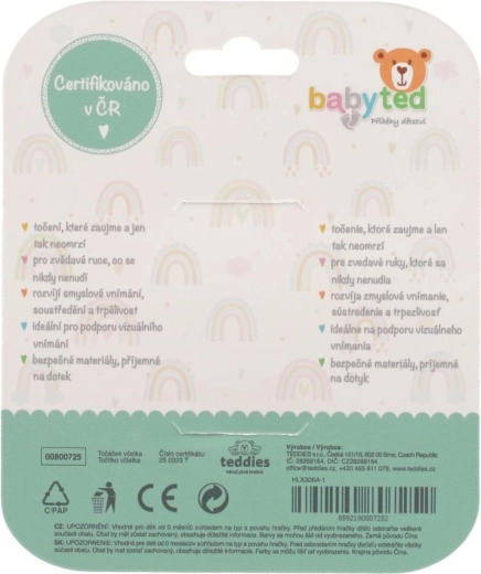 Ova vesela pčelica idealna je prva igračka za bebe. Zahvaljujući kompaktnoj veličini 9 × 7 cm dobro leži i u sitnim ručicama, dok glatki rubovi i ugodni materijali osiguravaju maksimalnu sigurnost. Rotirajući elementi donose jednostavnu interakciju koja prirodno razvija koordinaciju oko–ruka i znatiželju djeteta.