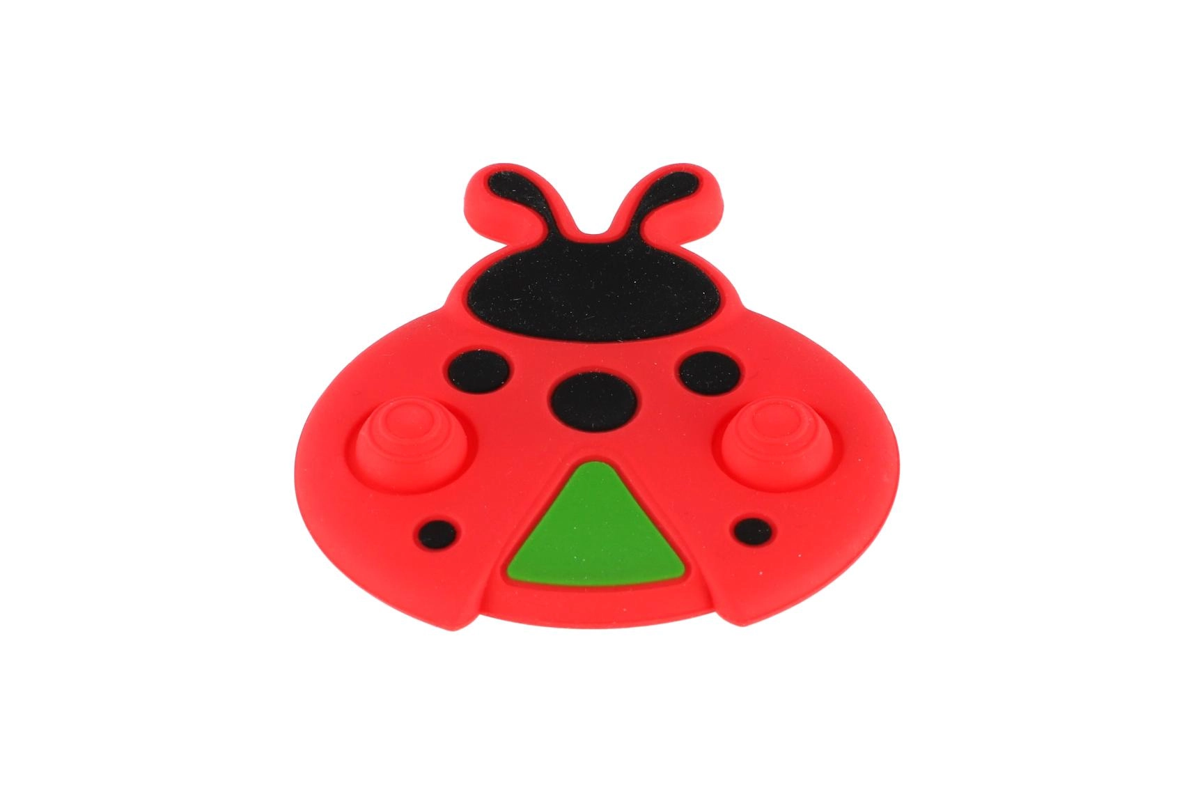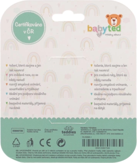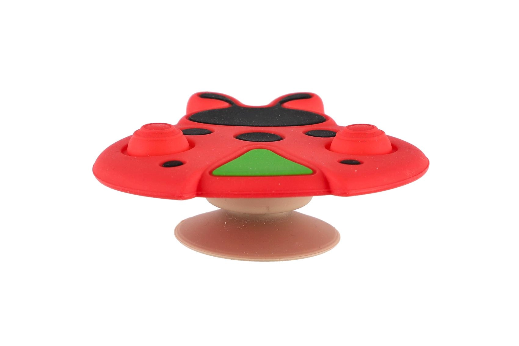 Rotirajuća sredina i taktilni elementi (mjehurići, ispupci) potiču stiskanje, okretanje i istraživanje, čime prirodno razvijaju koordinacijske vještine, hvat i finu motoriku. Kontrastna crvena s crnim točkama i zelenim detaljem podupiru vizualnu percepciju i zadržavaju dječju pažnju.
