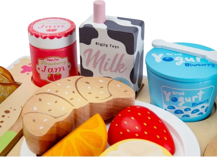 Pekarski proizvodi, voće, mlijeko, jogurt, marmelada, napici, tanjur, pribor i maslac – pojedini dijelovi imaju jasne oblike i boje za lako prepoznavanje i razvrstavanje.