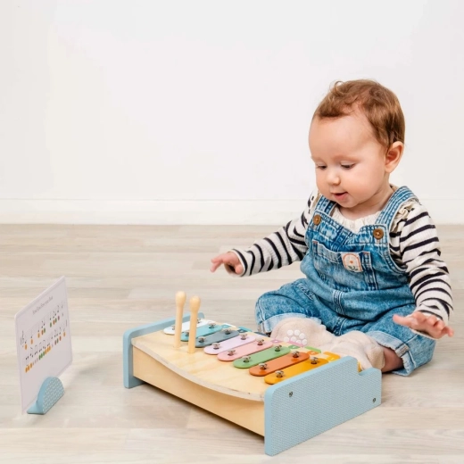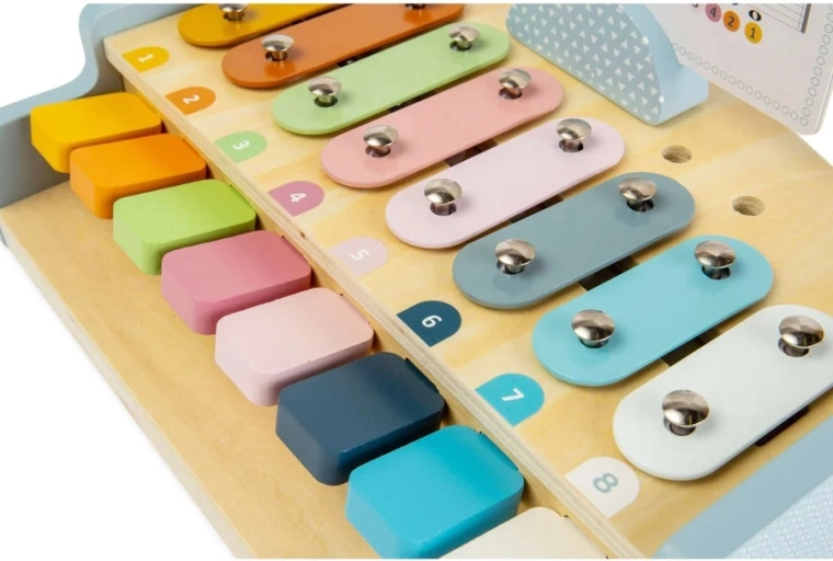Ova multifunkcionalna drvena glazbena igračka kombinira ksilofon i tipke u stilu klavira, kako bi djeca mogla istraživati svijet glazbe na različite načine. Pastelne boje i numerirani tonovi vode male glazbenike prema prvim sviranjima, dok priložene kartice s jednostavnim pjesmicama (npr. Jingle Bells, Wheels on the Bus) potiču samostalnost i radost učenja.