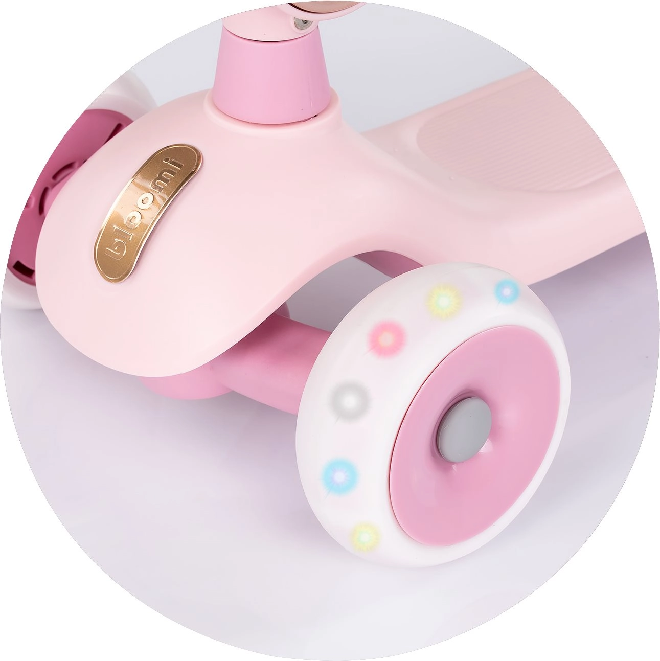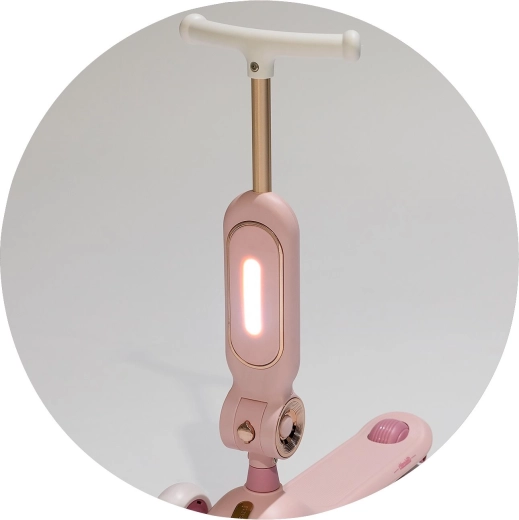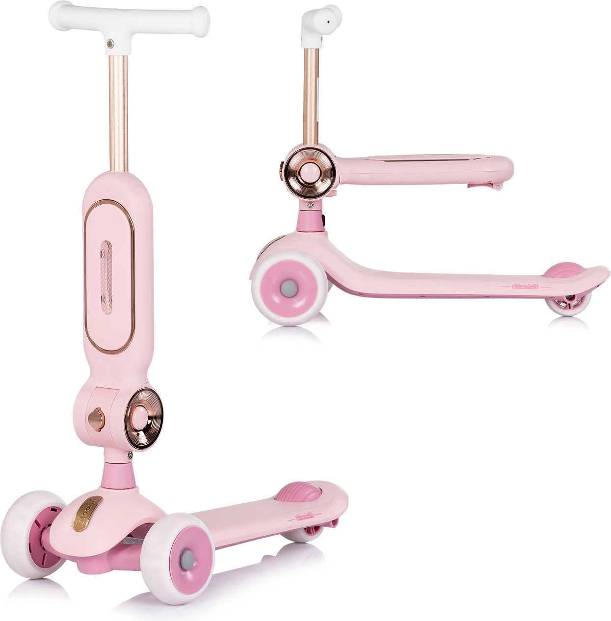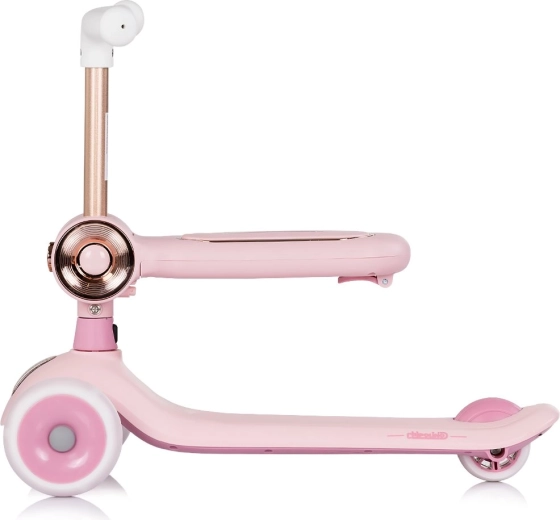 Dječji romobil 2u1 CHIPOLINO Bloomi u ružičastoj boji kombinira romobil i guralicu za maksimalnu svestranost. Nudi stabilnu trokolnu konstrukciju, svjetleće PU kotače, široku protukliznu platformu i stražnju nožnu kočnicu za sigurnu i zabavnu vožnju. Sjedalica pruža potporu manjoj djeci i potiče razvoj ravnoteže i koordinacije.