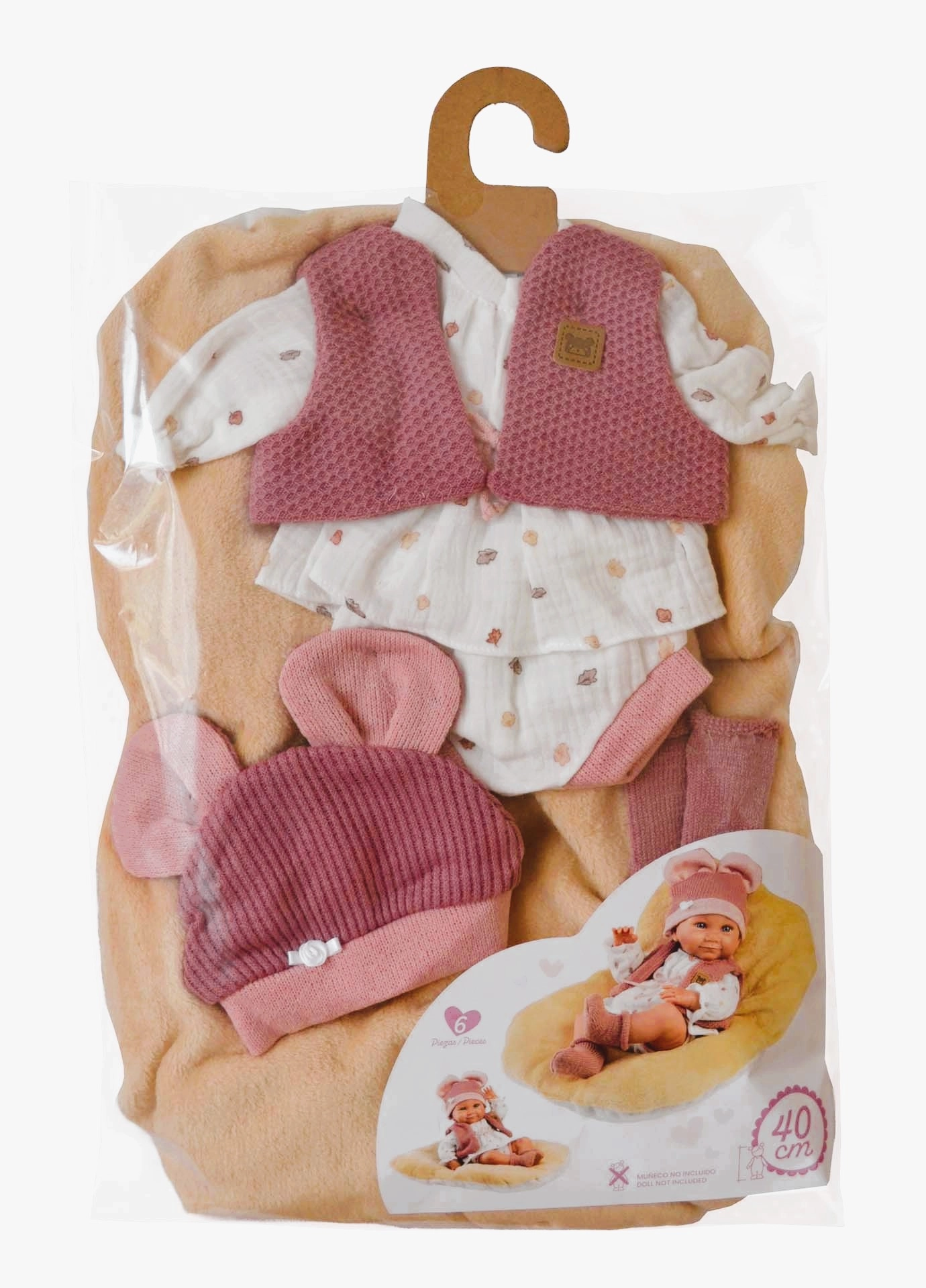 Paket uključuje 4 komada odjeće i obostrani jastučić koji se može koristiti i kao mekana podloga za udoban odmor lutke. Sve je ručno proizvedeno u Španjolskoj i isporučuje se u plastičnoj vrećici s vješalicom radi lakšeg spremanja.