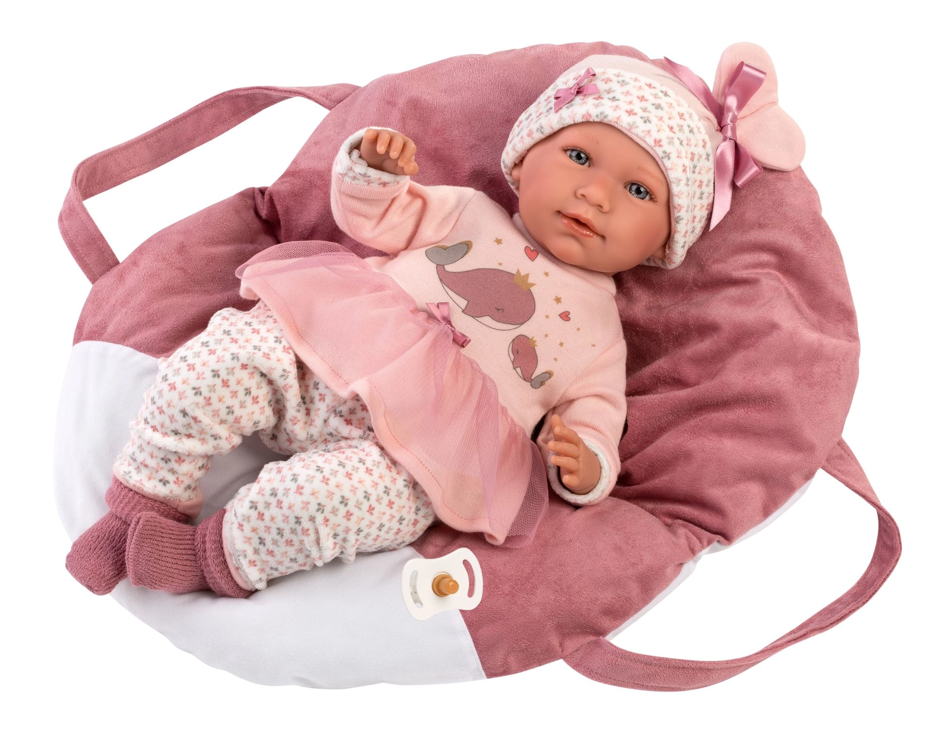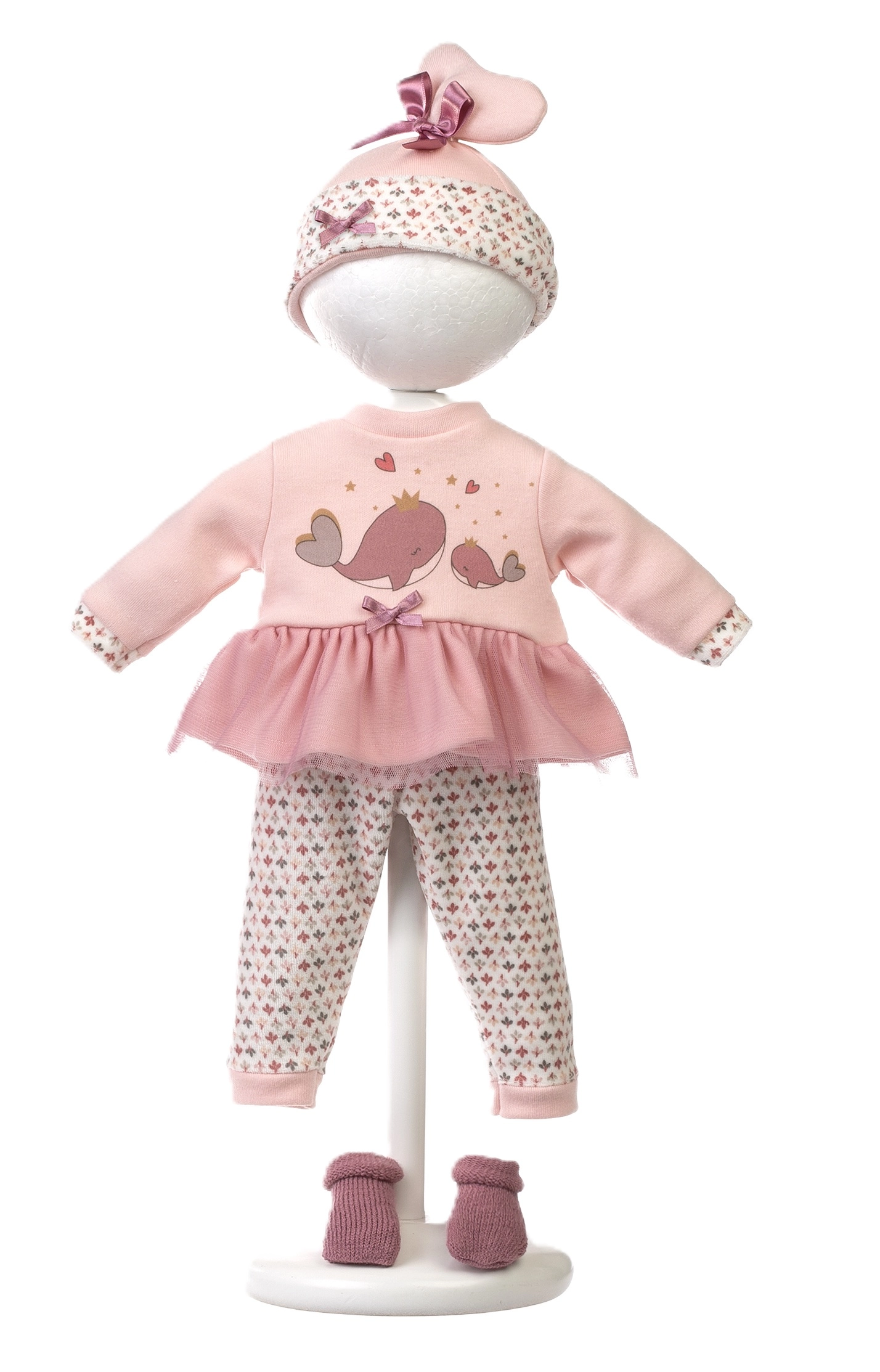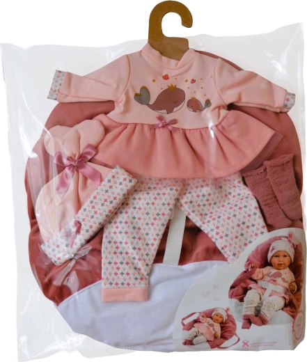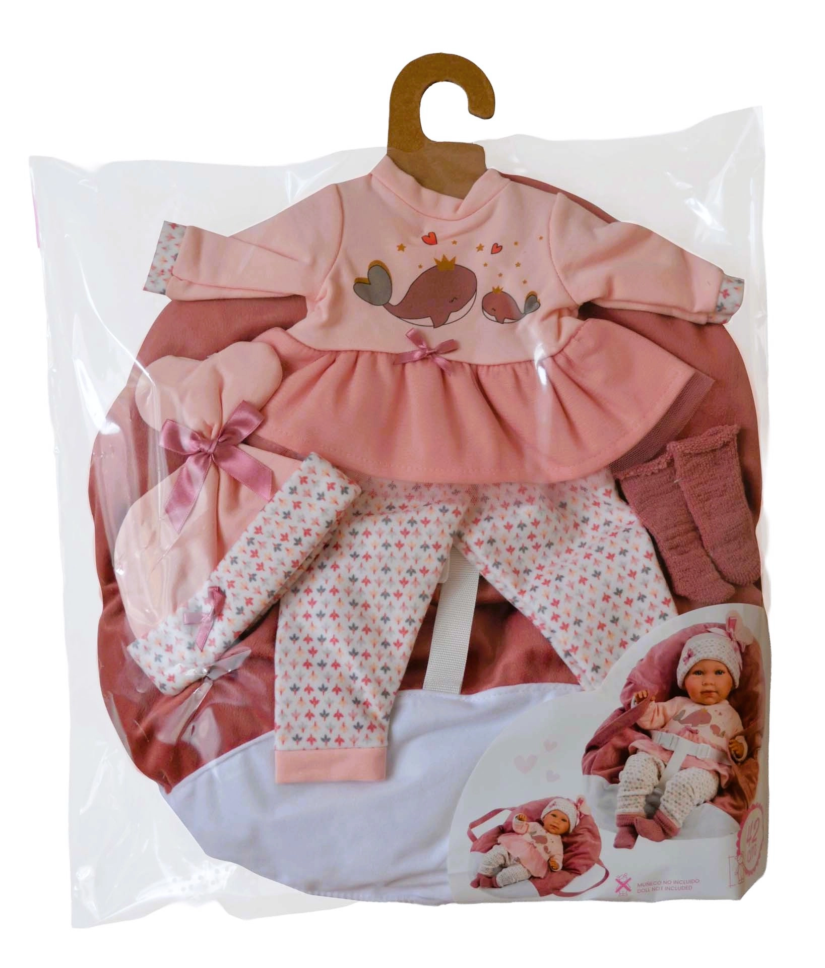 Uskladite lutku od glave do pete – ružičasti top/haljinica s motivom kitova, tajice, kapica i cipelice upotpunjeni su mekom ručnom nosiljkom.
