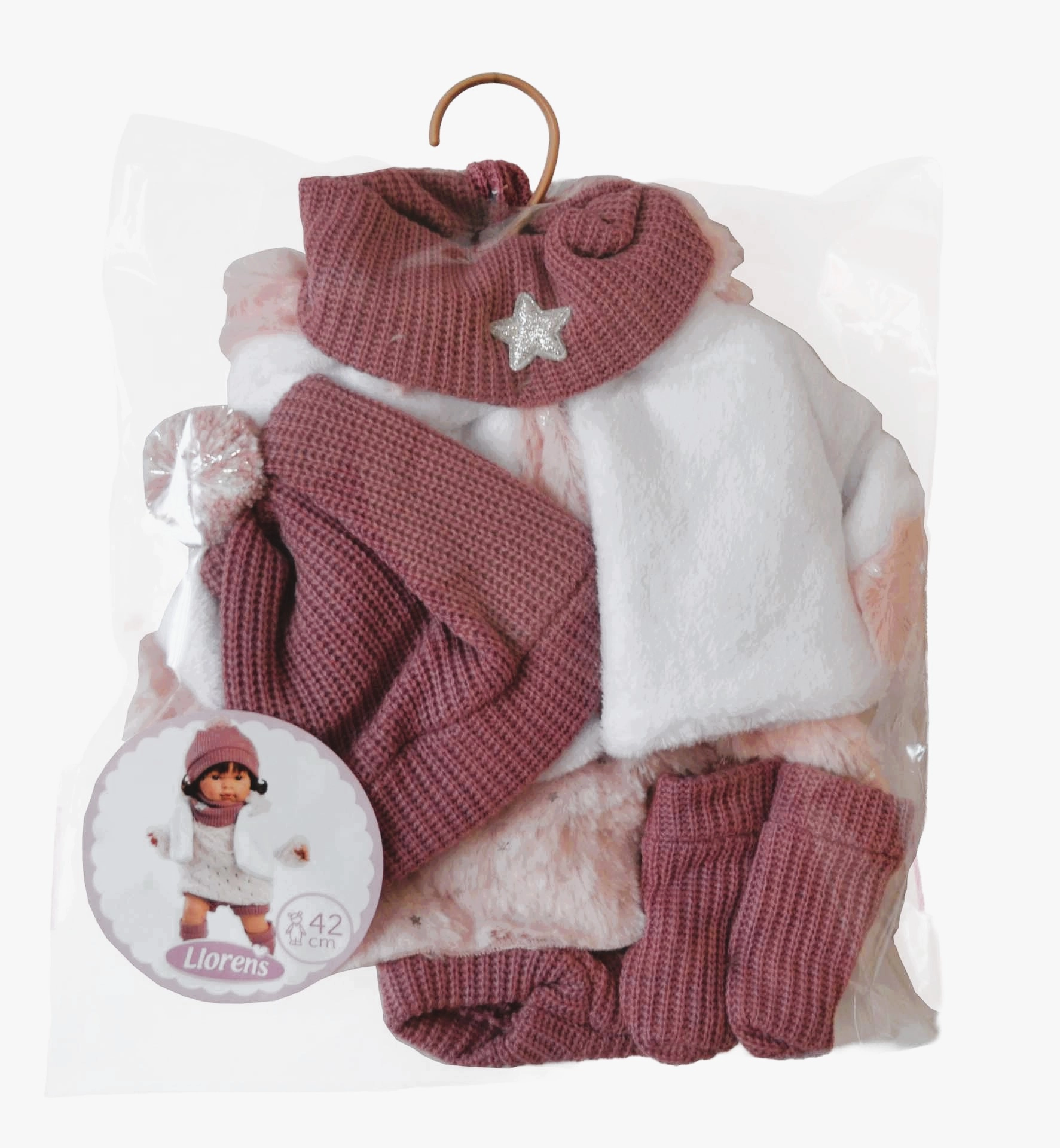 Stilski set odjeće za lutke Llorens veličine 42 cm razveselit će svaku malu njegovateljicu. Sadrži ukupno šest dijelova za potpuno presvlačenje lutke u zimski outfit. Odjeća je ručno izrađena u Španjolskoj, odlikuje se kvalitetnim materijalima i preciznom izradom. Praktično pakiranje na vješalici olakšava spremanje. Pogodno za djecu od 3 godine.