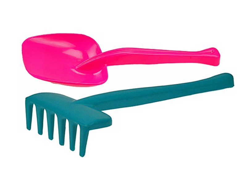 Lopatica i grablje imaju glatke, zaobljene oblike i udobne ručke kako bi ih djeca lako držala i jednostavno koristila pri igri na pijesku ili u vrtu.