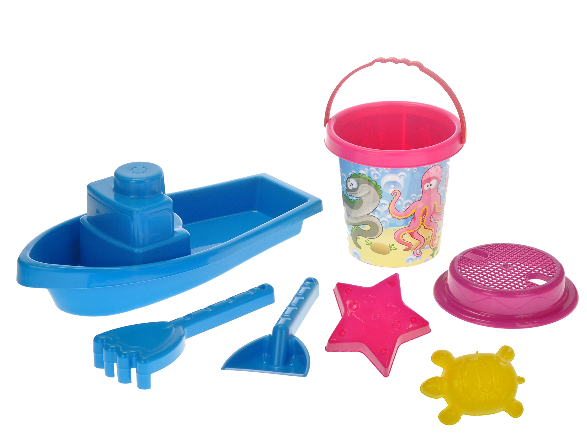 Zabavni set za pijesak s brodićem od 7 dijelova za male istraživače pijeska i vode. Sadrži kanticu, lopaticu, grabljice, sito, kalup i brodić u živim bojama koje će odmah privući djecu. Izrađeno od kvalitetne, zdravstveno ispravne plastike otporne na oštećenja. Pogodno od 10 mjeseci za poticanje fine motorike i kreativnosti. Praktično pakiranje u mrežici za lako prenošenje i pohranu.