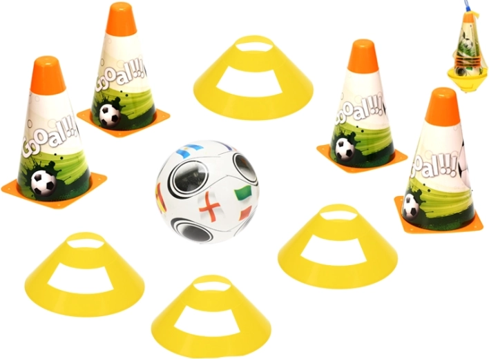 U pakiranju ćete pronaći 4 čunja (18 cm), mete i loptu (12 cm) – sve za zabavne vježbe driblinga, slaloma i preciznosti.