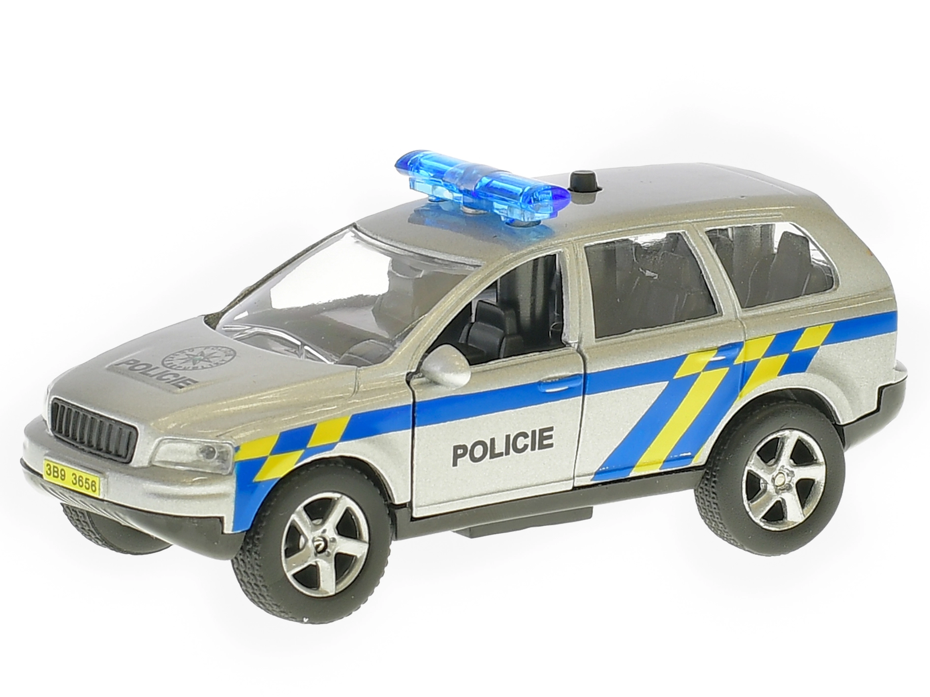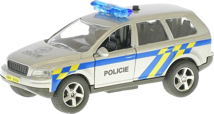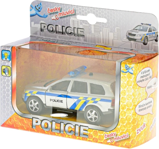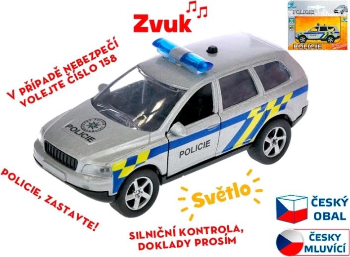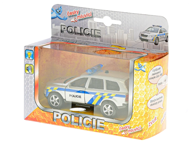 Realističan metalni policijski automobil duljine 11 cm sa sustavom povratnog pogona (pull back) kreće u akciju jednim povlačenjem. Model dodatno govori na češkom i koristi signalna svjetla, pa je igra još uzbudljivija. Na karoseriji se nalazi i važan broj hitne službe 158, koji će djeca lako zapamtiti.