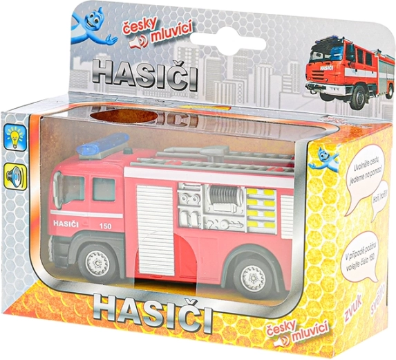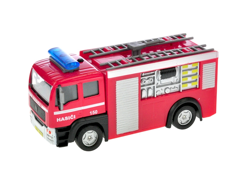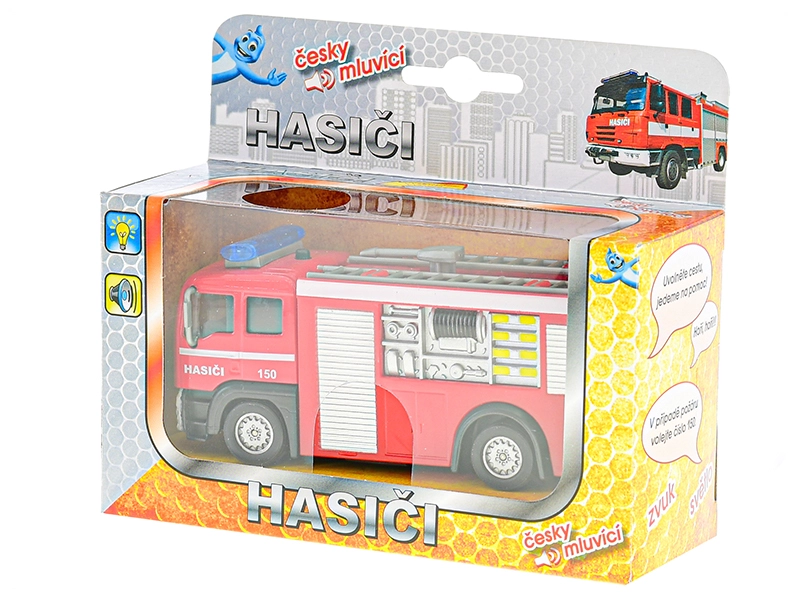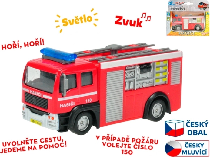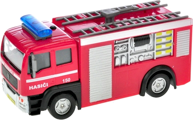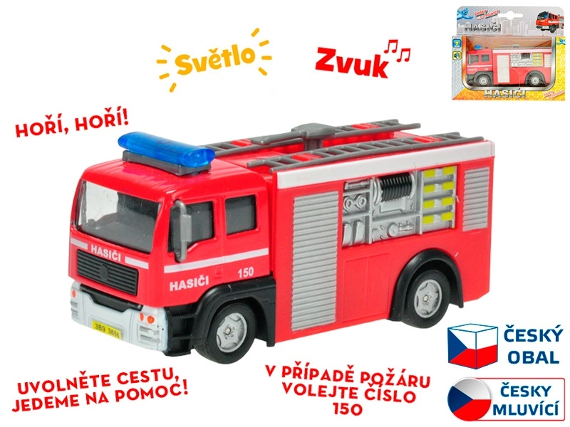 Realistično interventno vatrogasno vozilo duljine 12 cm razveselit će svakog malog spasitelja. Nakon povlačenja unatrag samo će se pokrenuti zahvaljujući sustavu povratnog pogona, uz upozoravajuće poruke na hrvatskom i svjetlosne efekte. Na karoseriji se nalazi i telefonski broj 193, koji djecu uči ispravnom pozivanju pomoći.