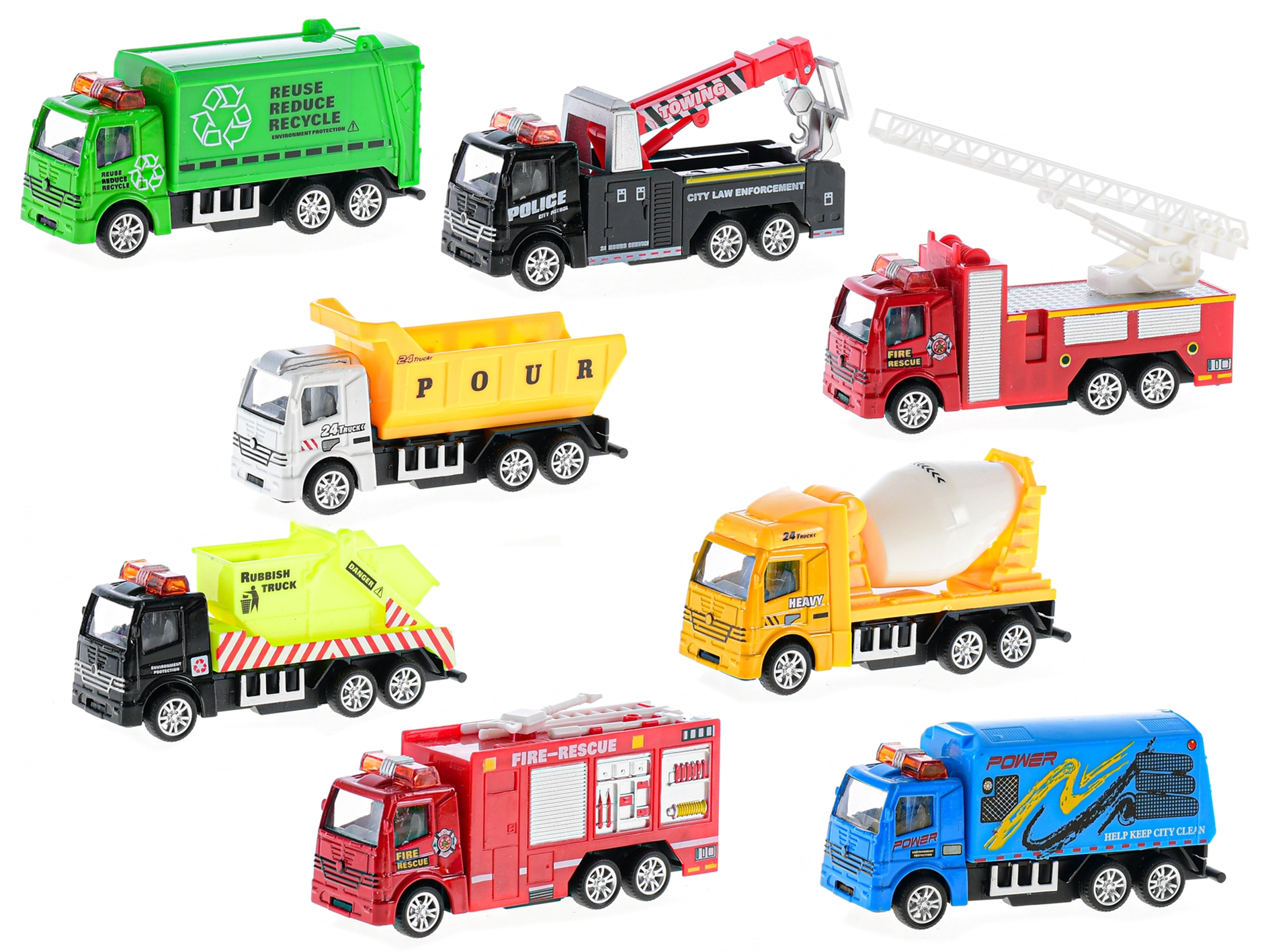 Izbor od 8 vrsta: smetlarski kamion, vučna služba, vatrogasci, kiper, miješalica i čistač ulica – idealno za stvaranje vlastitog grada.