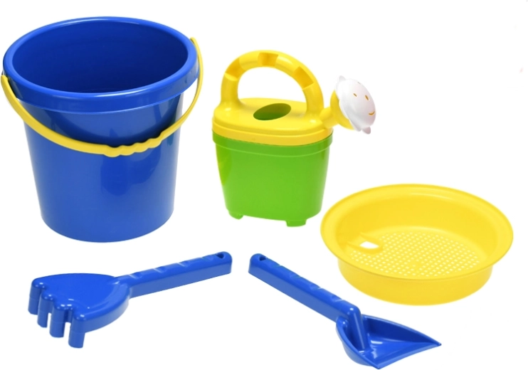 Kanta 17 cm, zalijevač 16 cm, sito, lopatica i grabljice – sve što djeci treba za gradnju dvoraca i prelijevanje vode na plaži i u pješčaniku.