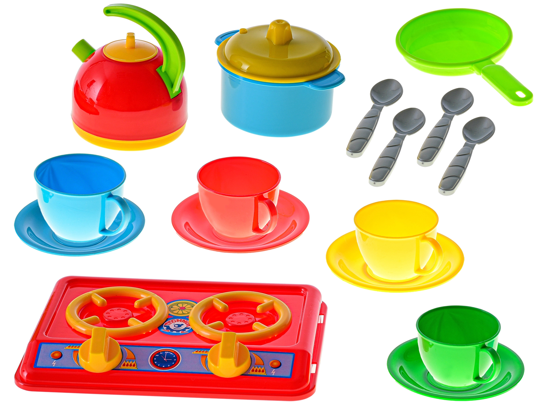 Ovaj šareni set za dječju kuhinju donosi sve što malim kuharima treba: štednjak s dvjema pločama i okretnim gumbićima, čajnik, lonac s poklopcem, tavicu te komplet šalica s tanjurićima i žličicama. Zahvaljujući laganoj i izdržljivoj plastici, s posuđem se lako rukuje i idealno je za svakodnevnu igru.