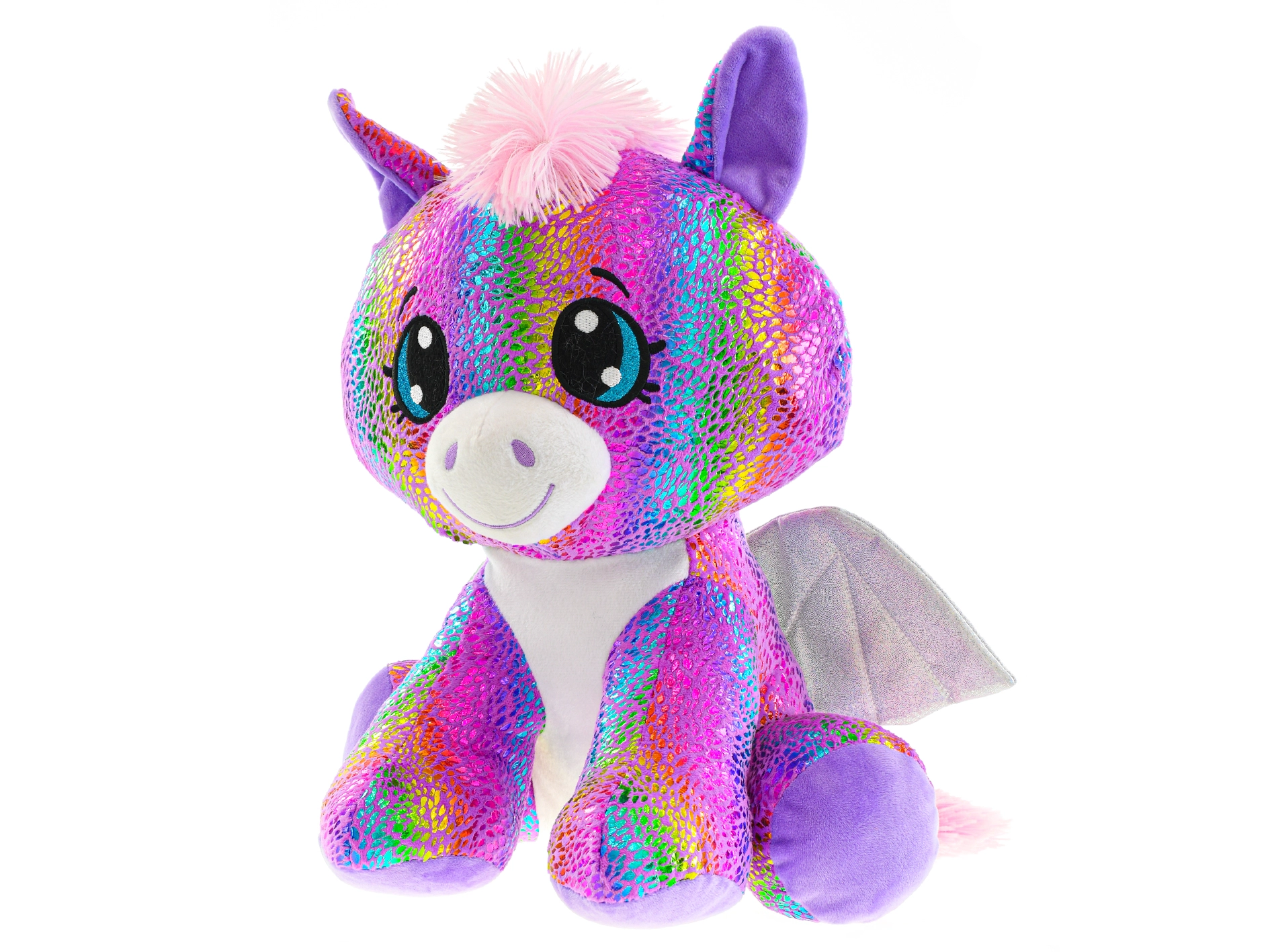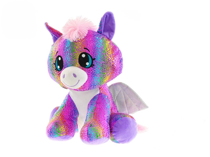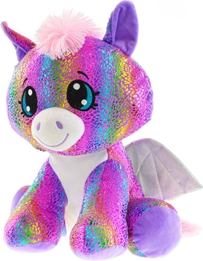Presladak plišani pegas u sjedećem položaju visine 24 cm osvojit će djecu na prvi pogled. Ima mekano tjelešce, dugini, blještavi dizajn i prijateljski izraz koji poziva na maženje i maštovitu igru.