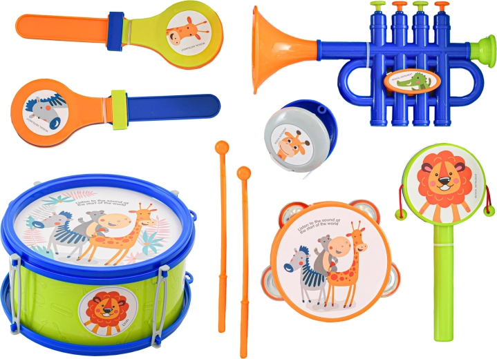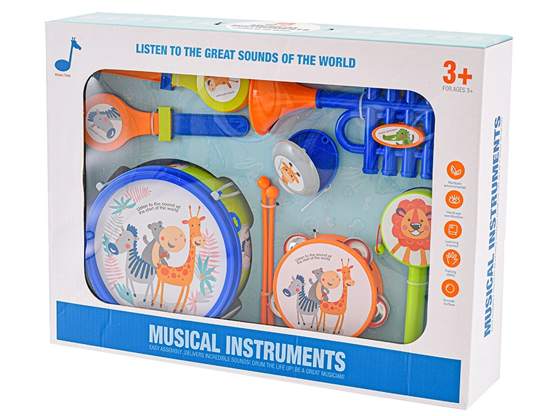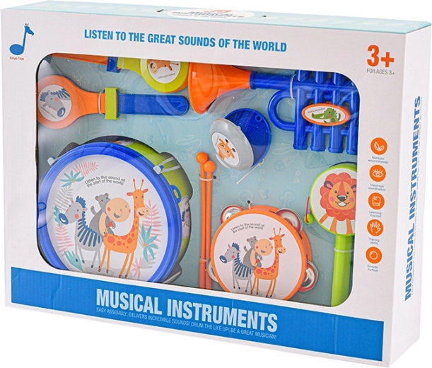 Ovaj dječji set glazbenih instrumenata donosi radost otkrivanja ritmova i melodija. U pakiranju se nalazi 7 lako upravljivih instrumenata dizajniranih s obzirom na dječje ruke i sigurnost. U kompletu su i palice za udobno sviranje. Sve je spremljeno u praktičnu kutiju koja olakšava pohranu i prenošenje.
