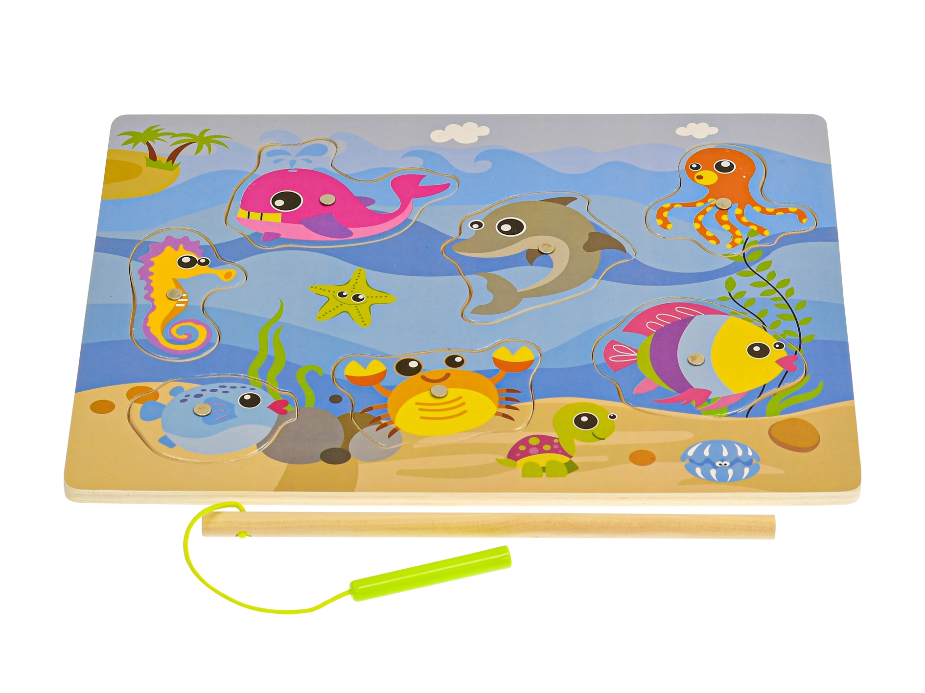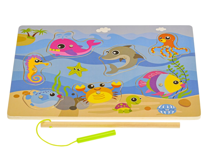 Zabavna i edukativna drvena magnetska igra za najmlađe od 24 mjeseca. Zahvaljujući magnetskom štapu djeca lako love šarene ribice, čime razvijaju finu motoriku, koordinaciju ruka–oko i strpljenje. Igraća ploča ujedno služi kao umetaljka za prepoznavanje oblika i logičko razmišljanje.