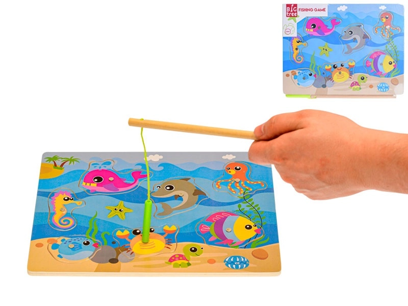 Drvena magnetska igra Ribe marke Big Tree donosi dvije zabavne aktivnosti u jednoj: lovljenje ribica pomoću magnetskog štapa i slaganje ribica u odgovarajuće otvore na igraćoj ploči. Kvalitetna drvena izrada je izdržljiva i sigurna za djecu, s glatkom površinom i ugodnim bojama.