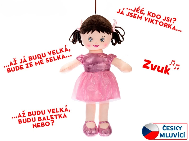 Lutka Viktorka je prekrasna platnena prijateljica veličine 32 cm, stvorena za svakodnevnu igru i uspavljivanje. Izgleda čarobno u svjetloružičastoj haljinici i cipelama, a zahvaljujući funkcijama govora i pjevanja donosi djeci još više radosti.