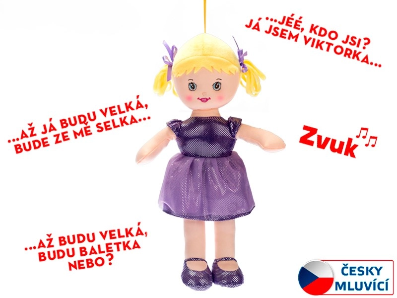 Slatka krpana lutka Viktorka u prekrasnoj ljubičastoj haljinici razveselit će svaku bebu i mališana. Ugodno je mekana, lagana za držanje i na hrvatskom može govoriti i pjevati omiljenu pjesmicu. Zahvaljujući visini od 32 cm idealna je za maženje i prvu igru te je prikladna od rođenja.