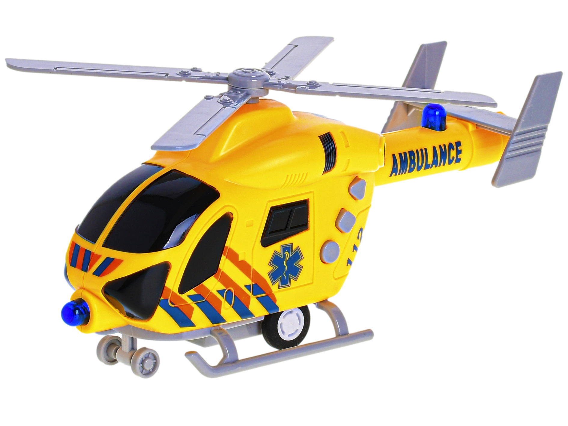 Ovaj plastični spasilački helikopter donosi djeci autentičan doživljaj spasilačkih misija. Zahvaljujući inercijskom pogonu lako se pokreće jednim potezom, a realistični svjetlosni i zvučni efekti pojačavaju atmosferu igre. Žuta izvedba s upečatljivim natpisom „ambulance” privlači pažnju na prvi pogled i potiče dječju maštu.