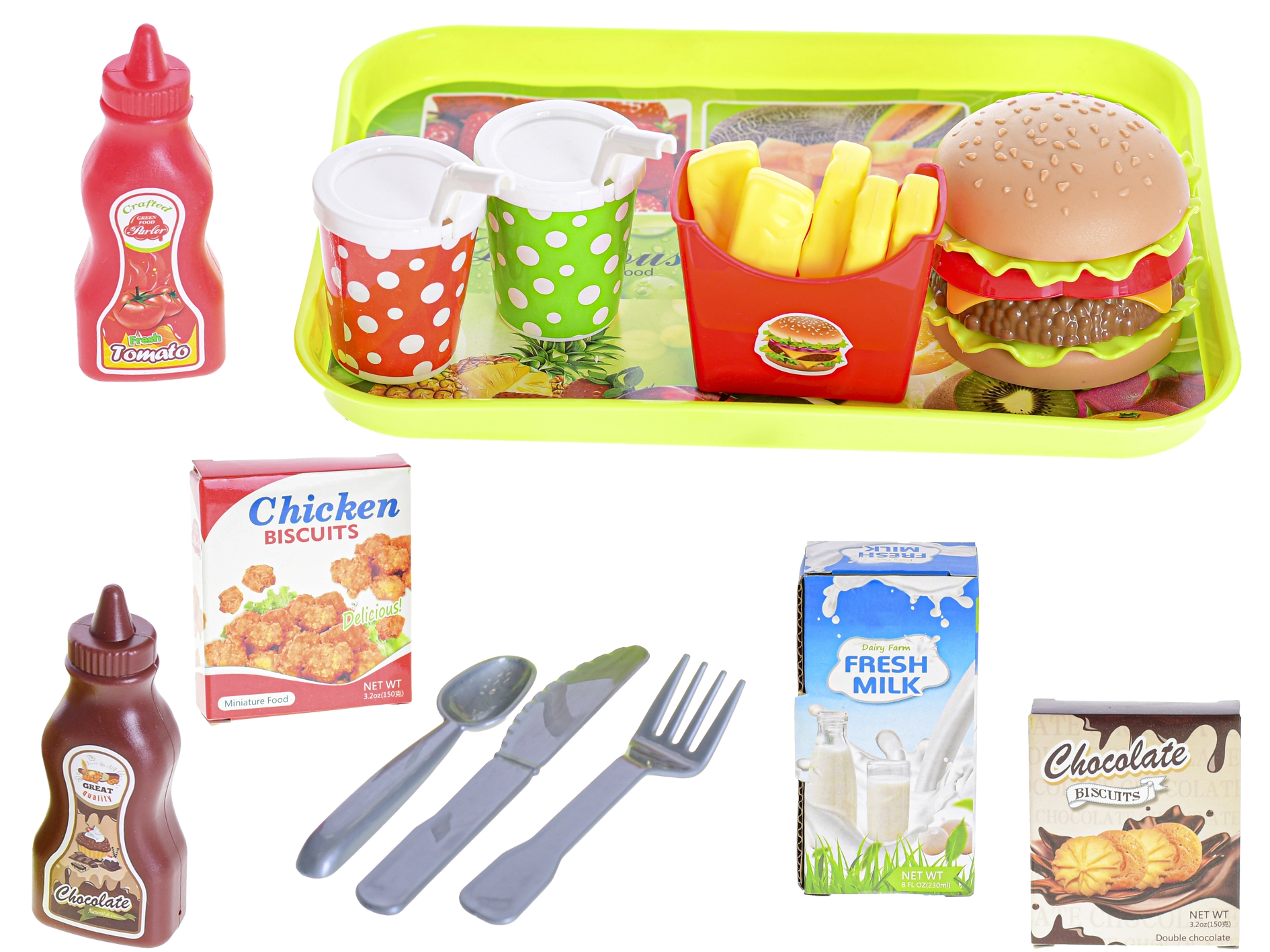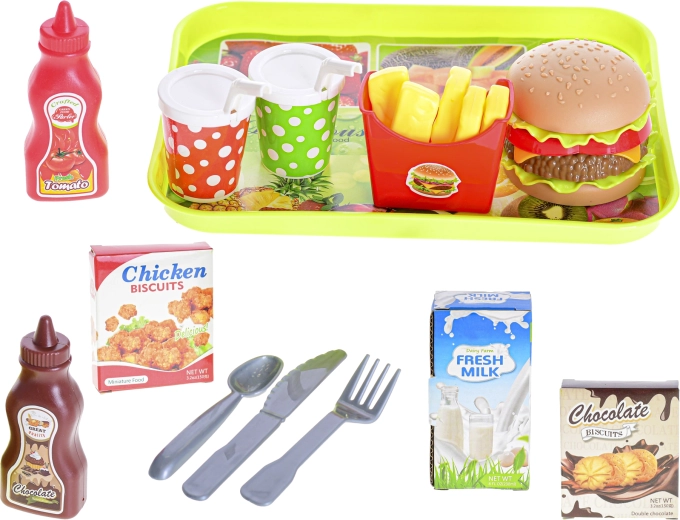 Zabavan set za male kuhare sadrži 13 realističnih plastičnih dijelova – hamburger, pomfrit, hot dog i druge poslastice. Zahvaljujući živim bojama i vjernoj izradi djeca će uživati u satima igre restorana ili piknika. Igračka potiče maštu, finu motoriku i socijalne vještine. Izrađeno od kvalitetne i sigurne plastike, sve je pohranjeno u praktičnoj vrećici za lako prenošenje.