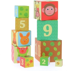Otkrijte razigrani set od 10 kartonskih kocaka s prelijepim ilustracijama životinja koji djecu uči brojati, prepoznavati boje i životinje. Sastavljanjem kule razvijaju finu motoriku i koordinaciju. Ekološki proizvedene i lagane kocake idealne su za lako slaganje i umetanje jedne u drugu.