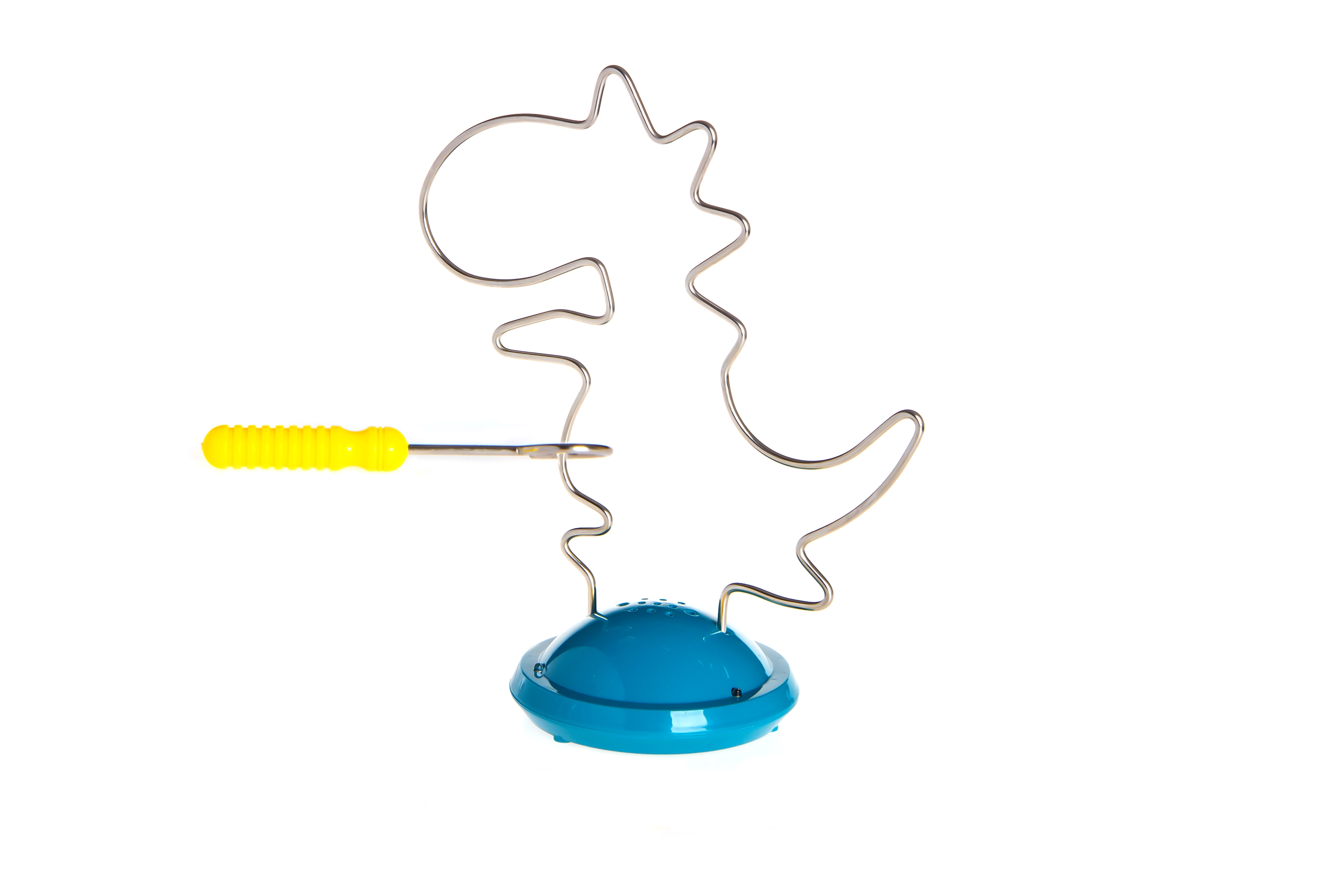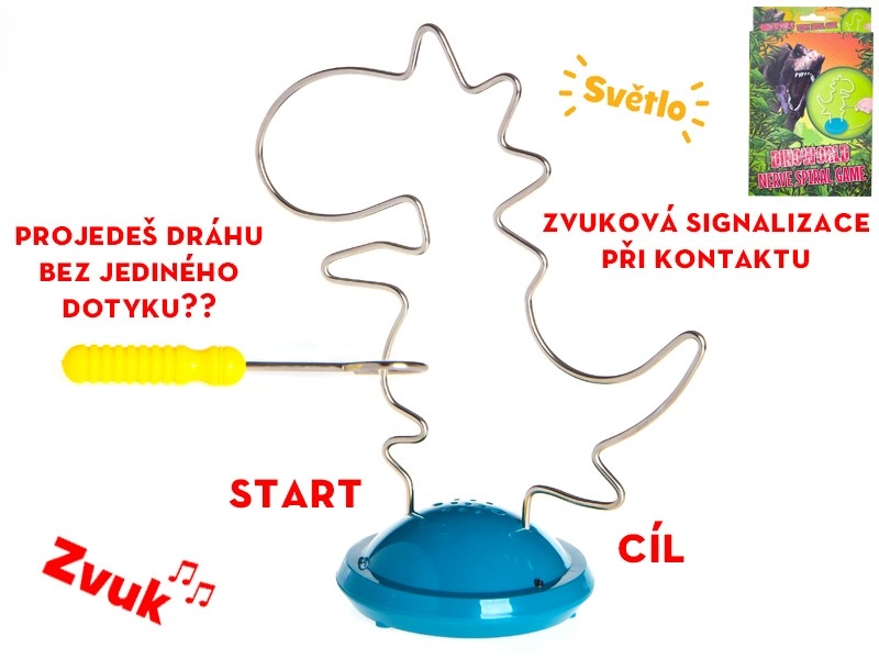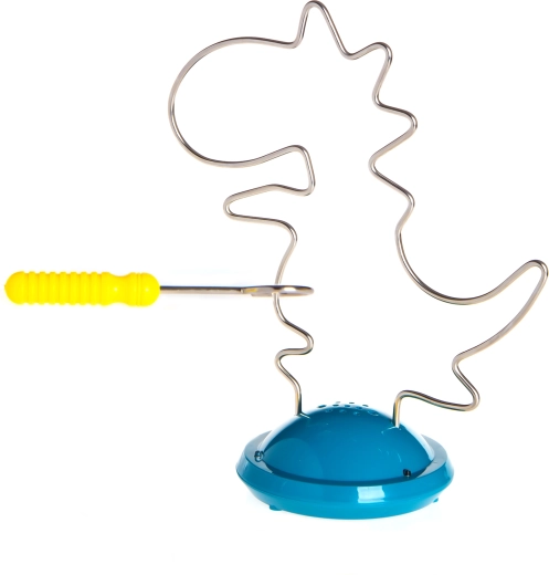 Interaktivna zagonetka u obliku dinosaura spaja zabavu i učenje: zadatak je voditi metalnu omču po stazi bez dodira. Pri kontaktu se aktivira zvučna signalizacija koja potiče na veću preciznost. Igra potiče koordinaciju ruke i oka, razvija finu motoriku te zahvaljujući svjetlosnim i zvučnim efektima privlači djecu na ponovno igranje. Izdržljiva izvedba od plastike i metala, prikladno za djecu od 3 godine.