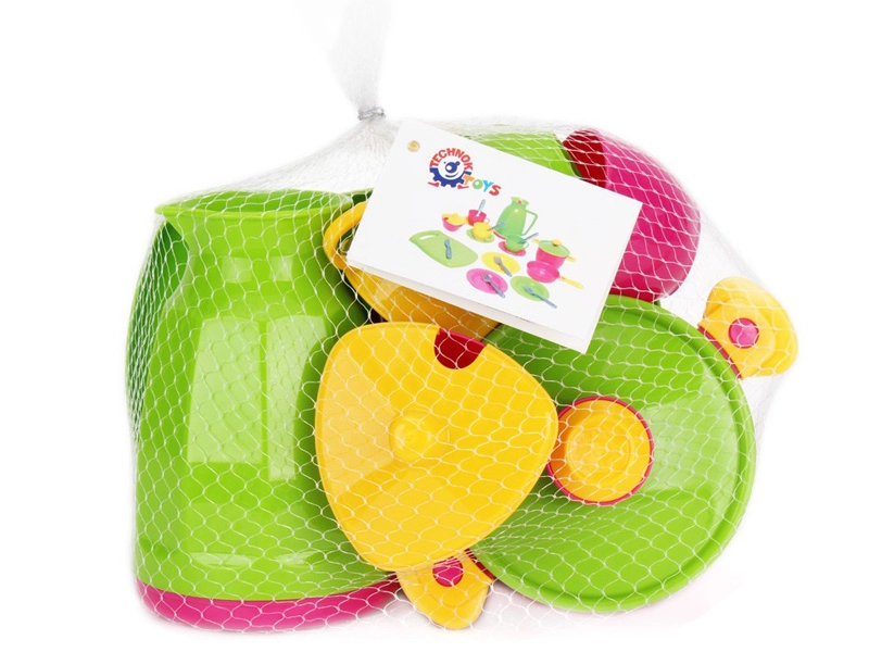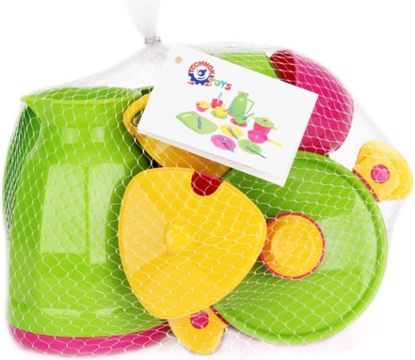 Šareni dječji set posuđa s 24 dijela za igru kuhanja i posluživanja razveselit će male kuhare i kuharice. Sadrži čajnik, lonac, tavu, tanjure, pribor za jelo, dasku za rezanje, šećernicu, šalice i tanjuriće. Lagana i izdržljiva plastika je sigurna za djecu od 3 godine. Praktično pakiranje u mrežici olakšava spremanje i prenošenje.