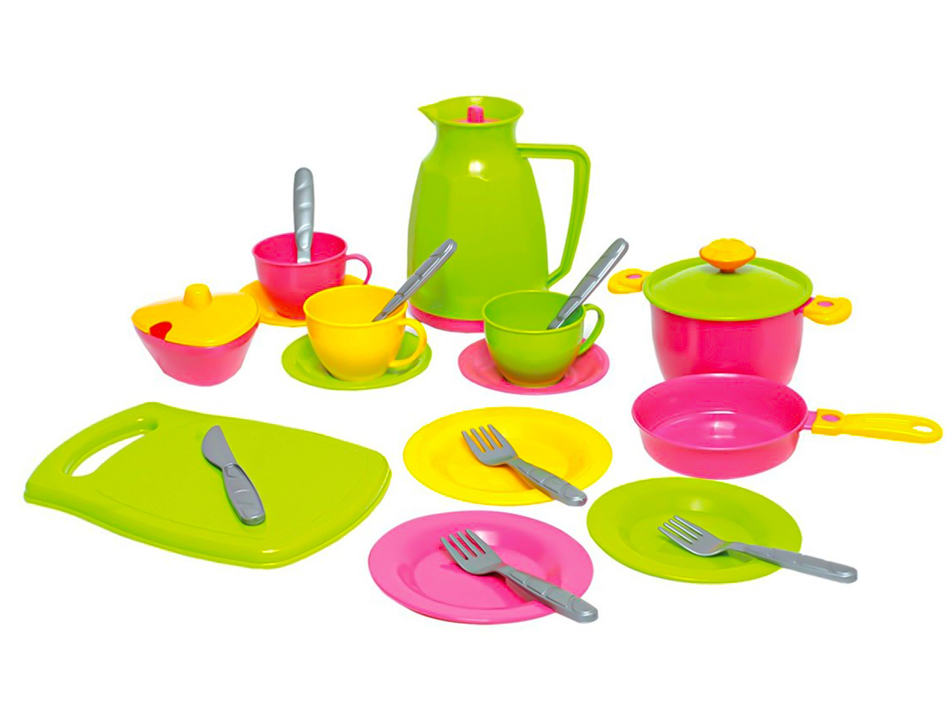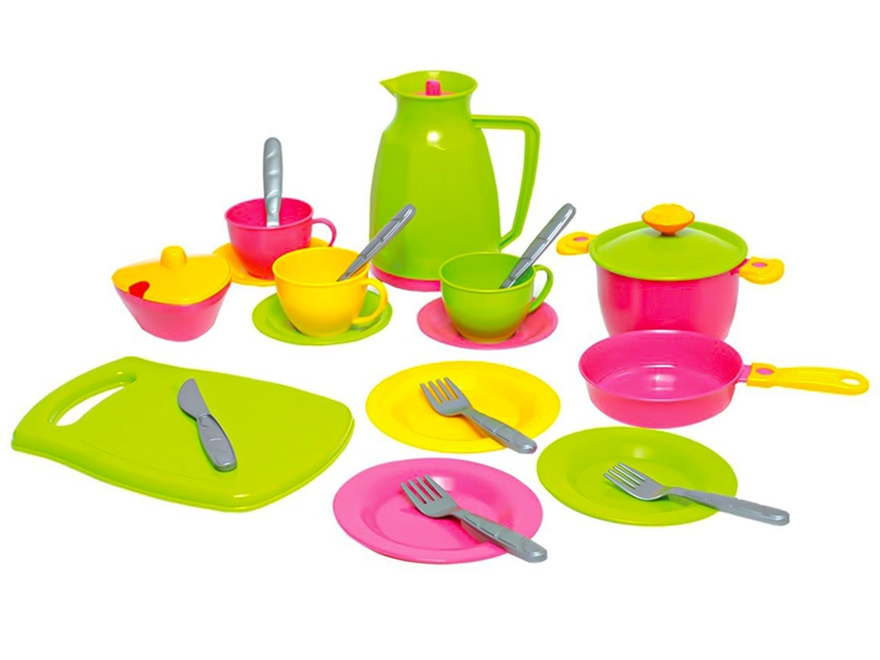 - Komplet od 24 dijela: čajnik, lonac s poklopcem, tava, tanjurići, šalice s tanjurićima, pribor za jelo, daska za rezanje, šećernica i drugi dodaci.