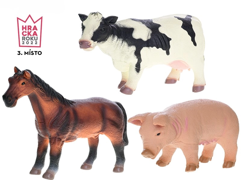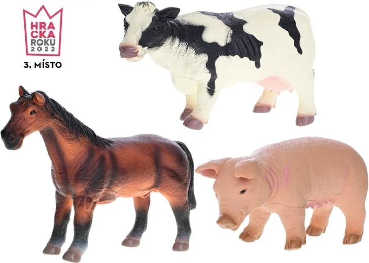 U pakiranju se nalaze 3 domaće životinje – konj, krava i prase. Izdržljiva plastika podnosi svakodnevnu igru kod kuće i na putu te se lako čisti. Ovaj je set savršen dodatak za male ljubitelje životinja i odlična osnova za izgradnju vlastite farme.