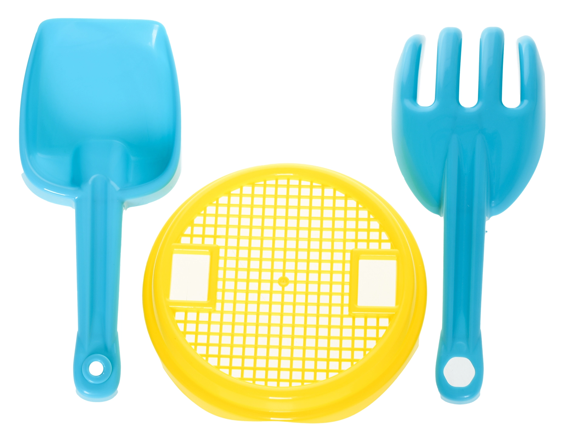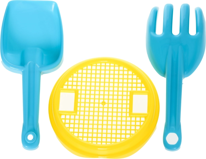 Pet neizostavnih dijelova – kanta, sito, lopatica, grabilice i kalup – za gradnju dvoraca, kopanje, prosijavanje i oblikovanje pijeska.