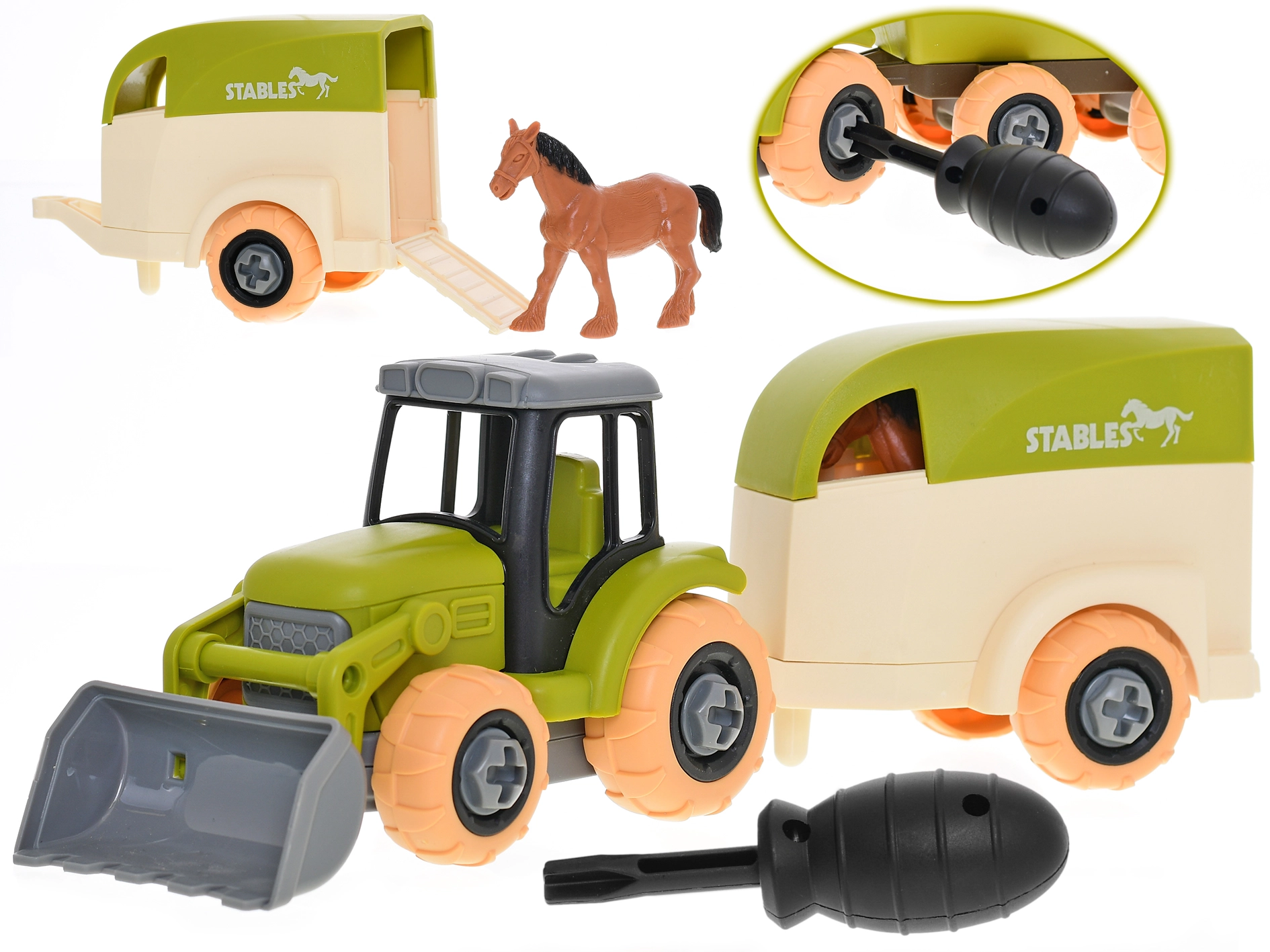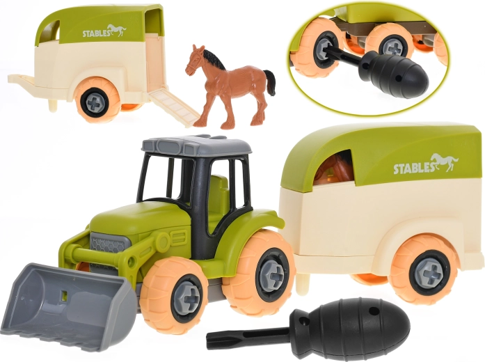 - Traktor, prikolica, figurica konja, odvijač
