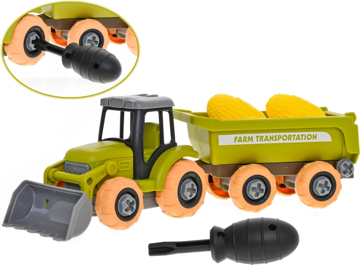 Ovaj detaljno izrađen traktor s prikolicom osmišljen je da zabavi i pouči. Uz priloženi odvijač djeca mogu sigurno rastaviti i ponovno sastaviti pojedine dijelove, čime uvježbavaju koordinaciju ruku i očiju te logičko razmišljanje. Odvojiva prikolica i dva klipa kukuruza potiču kreativnu igru i upoznavanje svijeta poljoprivrede.