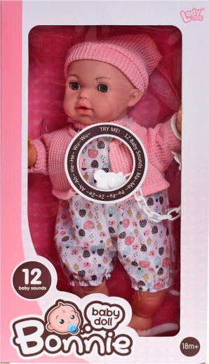 Slatka lutka veličine 30 cm idealan je pratitelj za male njegovateljice. Ima mekano tijelce ugodno na dodir, treptajuće oči za realističniju igru i 12 zvukova koji se aktiviraju pritiskom. U pakiranju je duda, a napajanje osiguravaju 3× AG13 baterije (uključene). Prikladno za djecu od 18 mjeseci.