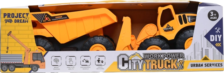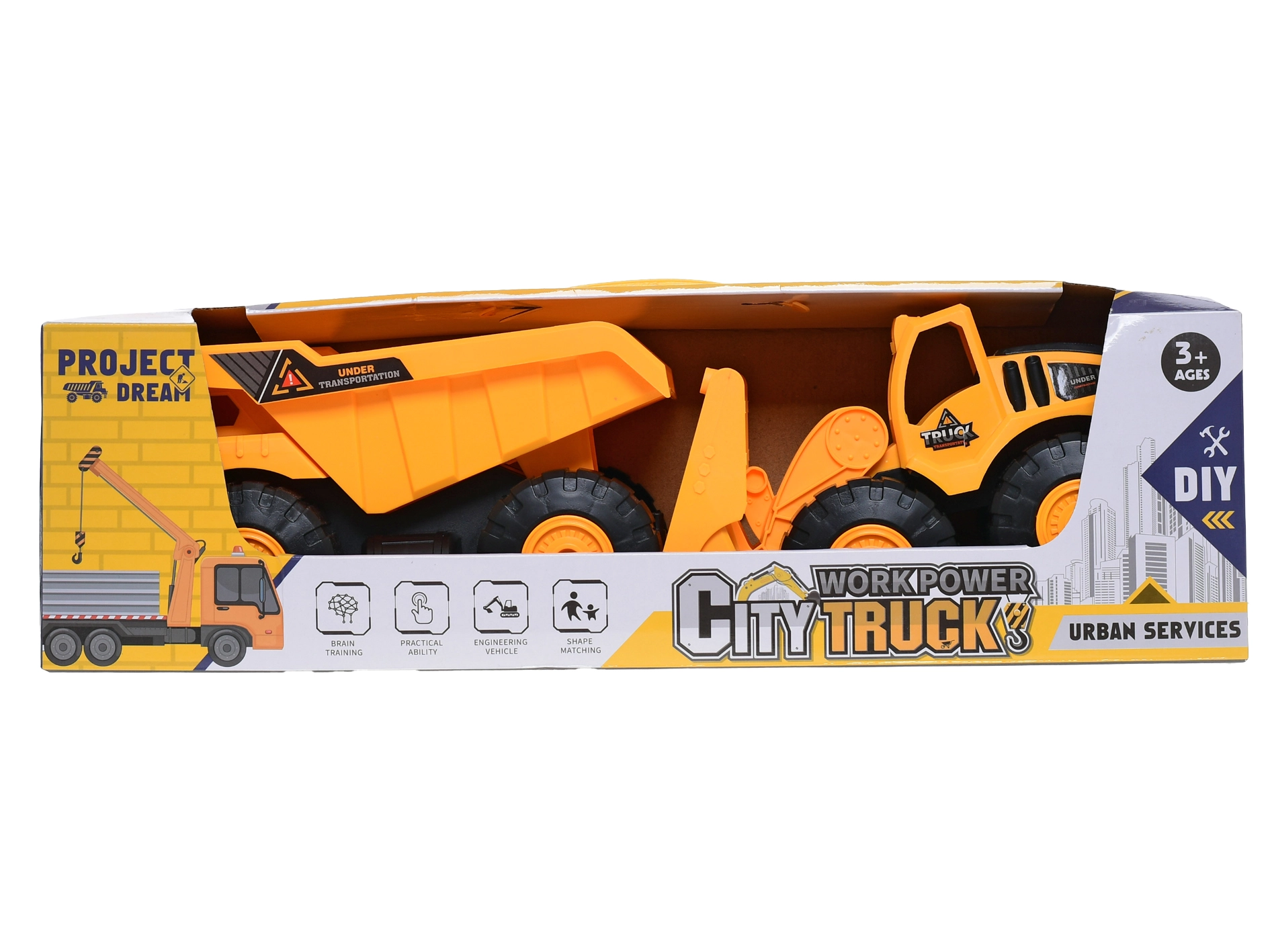 Otkrijte zabavni građevinski set s dva detaljno izrađena vozila – rovokopačem utovarivačem (24 cm) i kiperskim kamionom (26 cm). Obje igračke su od kvalitetne plastike, imaju slobodan hod za glatko kretanje te nude realistične detalje i pokretne dijelove koji potiču dječju maštu i spretnost. Idealno za igru u kući i na otvorenom, primjerice u pješčaniku. Prikladno od 3 godine.