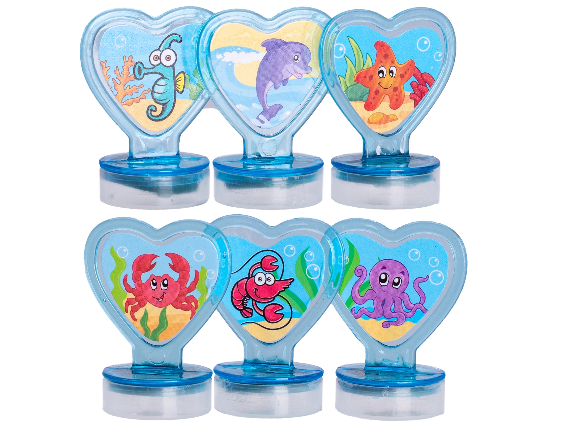 Set žigova Morski svijet donosi djeci radost stvaranja s ribicama, hobotnicom, morskom zvijezdom i drugim morskim motivima. Svaki je žig oblikovan za udoban hvat i lako otiskivanje, kako bi i mlađa djeca bezbrižno uživala u kreativnosti.