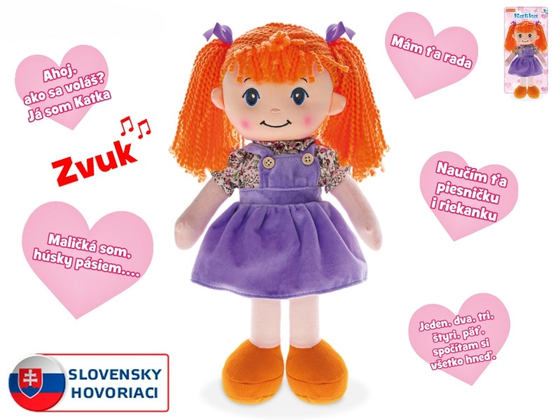 Lutka Katka očarat će djecu svojim crvenkastim vlasima i simpatičnim izrazom. Zahvaljujući nježnoj plišanoj izradi ugodna je na dodir i sigurna za dječji zagrljaj već od prvih dana. Pritiskom na trbuščić počinje govoriti i pjevati na slovačkom – brojalice, pjesmice i prijateljske fraze potiču razvoj jezičnih vještina te osjećaj za ritam i zvuk.