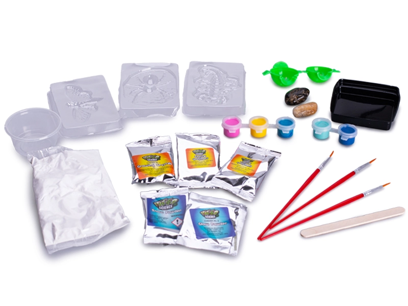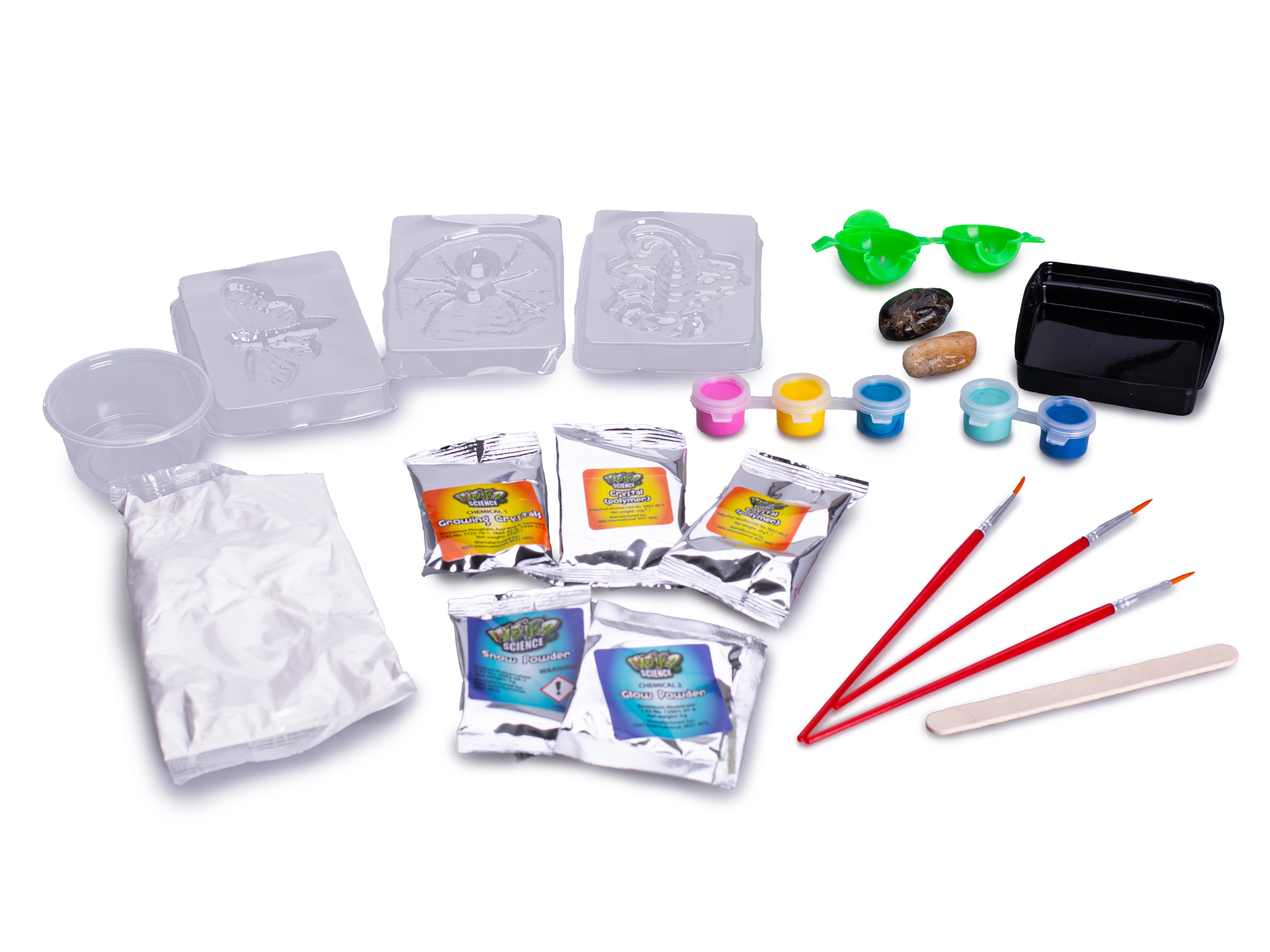 - Kuka sa svjetlećim naljepnicama (1×), kist (3×), boja (5×), polimerni kristali (2×), kalup (razni oblici), kamenčići (2×), gips (1× pakiranje), smjesa za rast kristala (1×), svjetleći prah (1×), drvena štapić (1×), PVC podloga (1×), kalupi za kukce (3×), posuda za miješanje (1×)