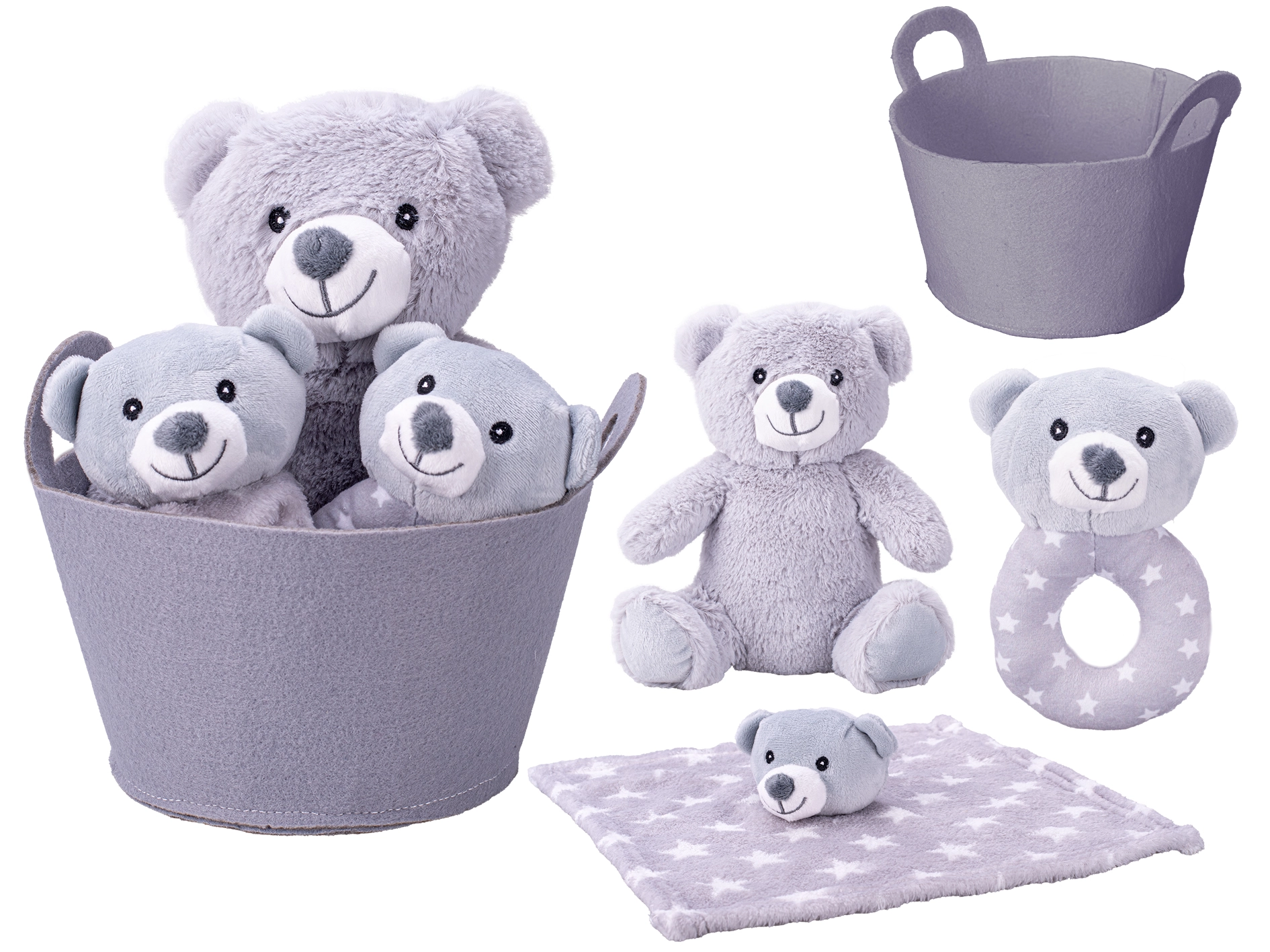 Presladak poklon set za novorođenče sadrži mekanog sivog plišanog medvjedića 20 cm, zvečku 13 cm za razvoj osjetila i nježnu tješilicu za mirno uspavljivanje. Sve je elegantno smješteno u dekorativnoj košarici, koja se može koristiti i kao praktičan prostor za pohranu. Izrađeno od kvalitetnog i sigurnog pliša, prikladno od rođenja.