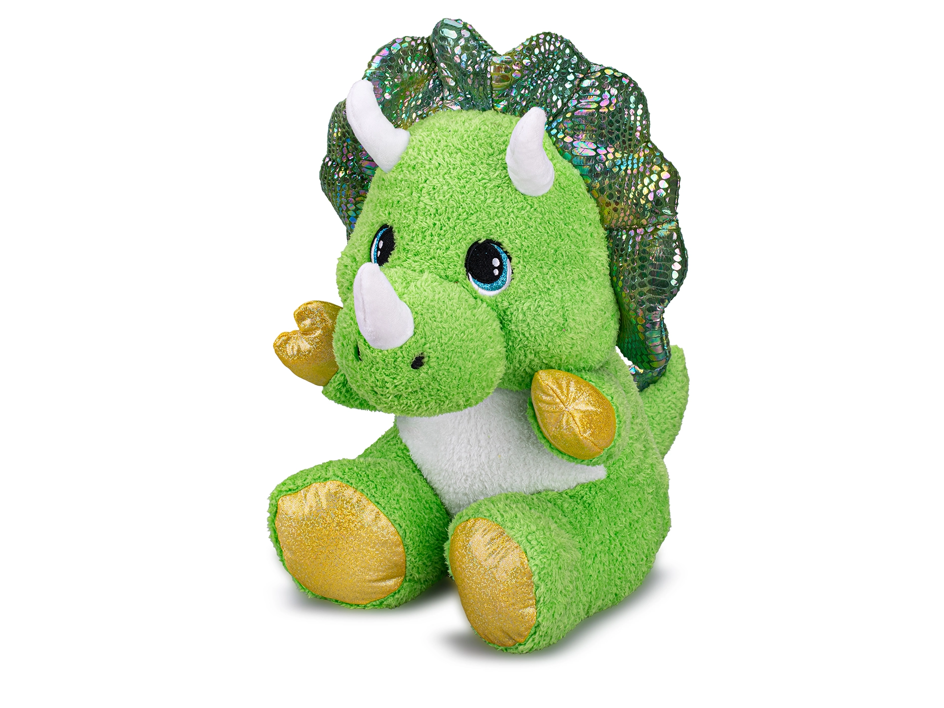 Preslatki plišani triceratops veličine 37 cm u sjedećem položaju mekani je pratitelj za najmlađu djecu već od rođenja. Zahvaljujući nježnom i sigurnom materijalu idealan je za maženje i miran odmor. Zelena boja i detaljna izrada potiču dječju maštu i čine igračku privlačnim poklonom za male ljubitelje dinosaura.