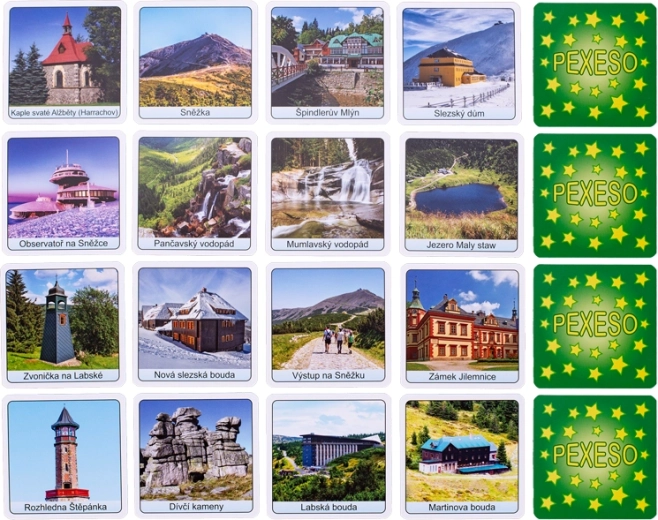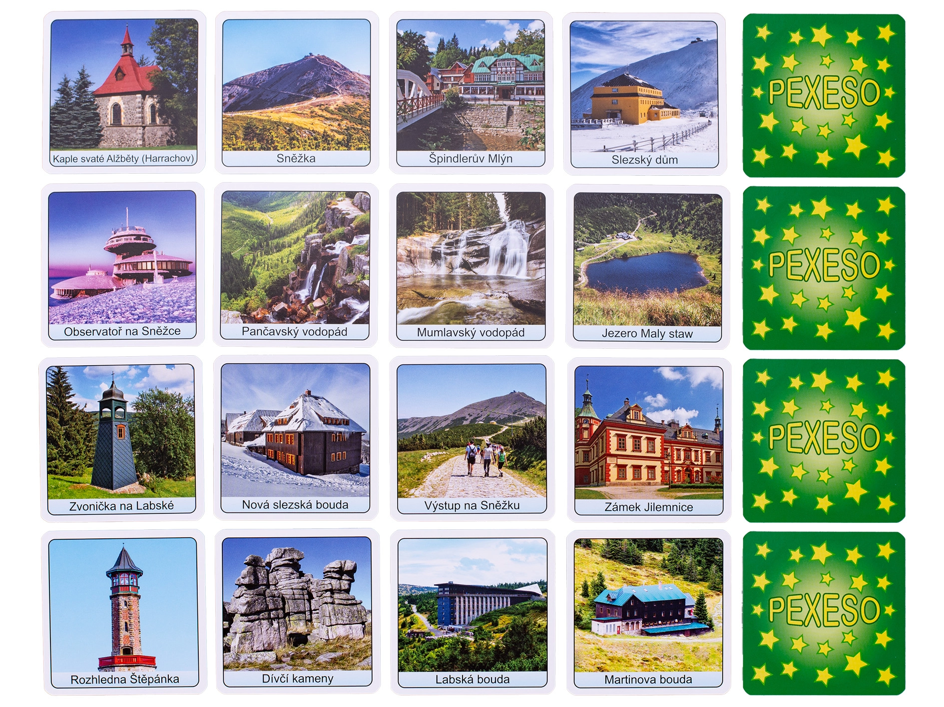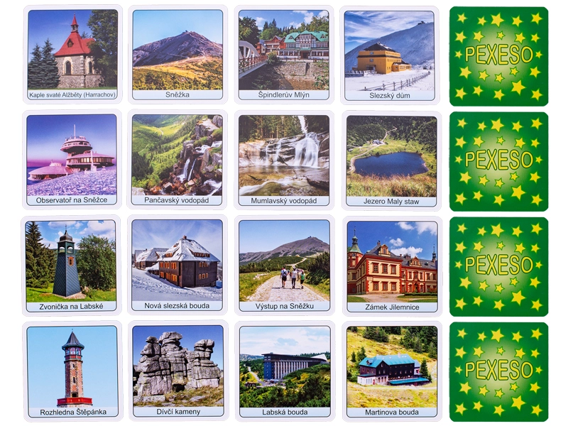 Pexeso Krkonoše je omiljena memorijska igra s originalnim motivima najvišeg češkog gorja. Djeca i odrasli vježbaju koncentraciju, pamćenje i strpljenje dok otkrivaju slikovita mjesta poput Sněžke, Labskog dola i Crne gore. Zahvaljujući kompaktnoj kutijici, pexeso je idealan suputnik na putovanja, godišnje odmore i vikend izlete.