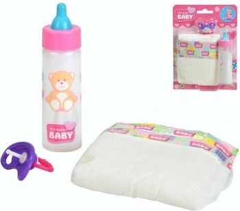Praktičan set dodataka za lutke iz linije New Born Baby sadrži dudu, pelenu i bočicu s nestajućim mlijekom, koja pri “pijenju” stvara zabavan efekt. Idealno za djecu koja se žele igrati brige o bebi. Pogodno za lutke 38–43 cm.