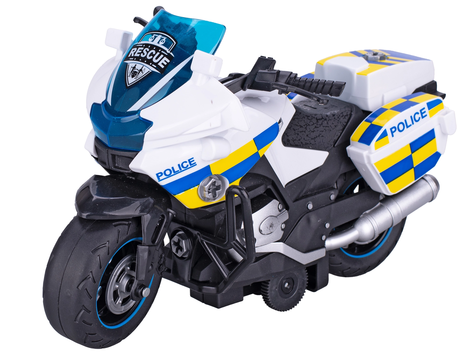 Ovaj plastični policijski motor dizajniran je s naglaskom na detalje i realistične elemente koji potiču dječju maštu. Zahvaljujući vijčanim dijelovima, djeca mogu motor sama rastaviti i sastaviti, čime vježbaju spretnost i koordinaciju oko–ruka. Pogon na zamašnjak daje igri dodatni šarm – nakon navijanja motor živahno jurne naprijed.
