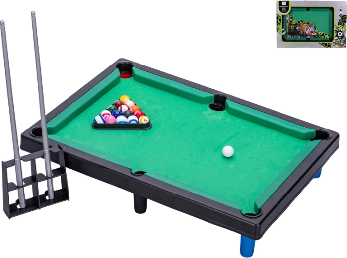 Kompaktni stolni biljar dimenzija 41,5 × 28,5 cm donosi zabavu u svaki dom. Zahvaljujući jednostavnom postavljanju na stol možete igrati bilo kada i bilo gdje bez potrebe za velikim prostorom. Set sadrži 2 štapa i 16 kugli za potpunu igru dvaju igrača. Pogodno za djecu od 3 godine, dostupno u 2 boje – zelenoj i plavoj.