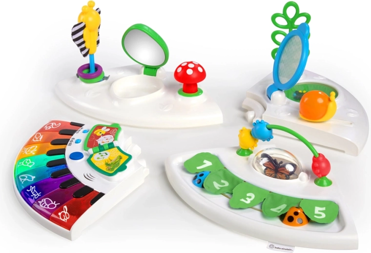 Aktivni centar Baby Einstein Around We Grow 4u1 prilagođava se svakoj fazi razvoja. Od stacionarnog hodalica-sjedišta do senzornog stola, uklonjivih igraćih stanica i ravne radne plohe za stvaranje – sve u jednom pametnom rješenju. Dijete može istraživati više od 15 elemenata za igru, razvijati finu motoriku, razumjeti uzrok i posljedicu te učiti boje i nazive životinja na engleskom, francuskom i španjolskom jeziku.